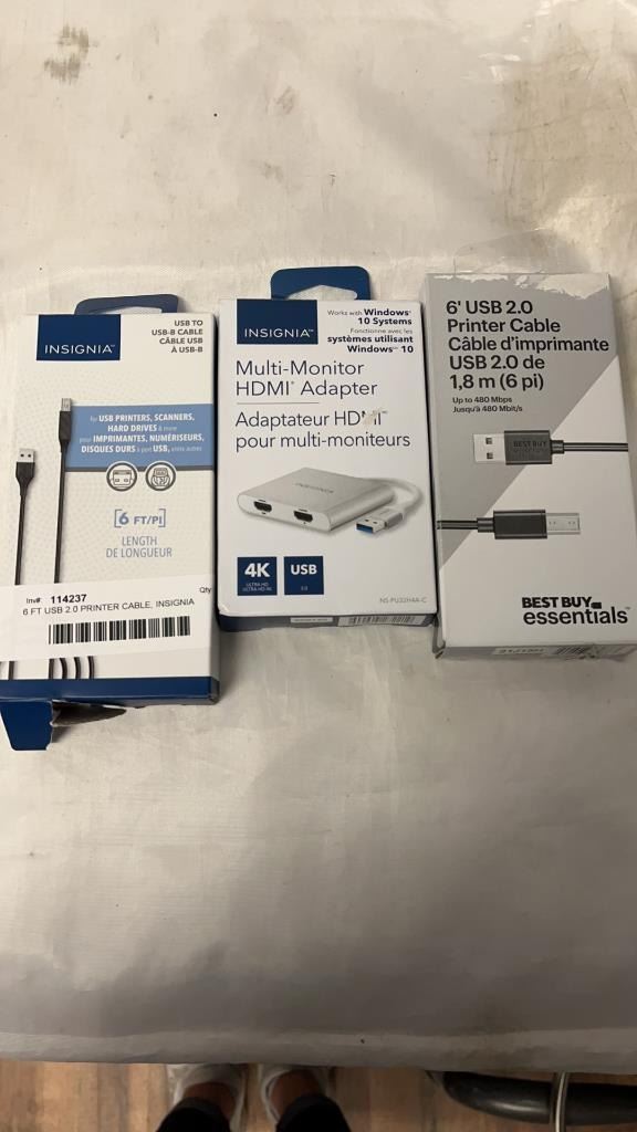 6 FT USB 2.0 PRINTER CABLE, INSIGNIA MULTI MONITER HDMI ADAPTER, AND USB TO USB-B CABLE