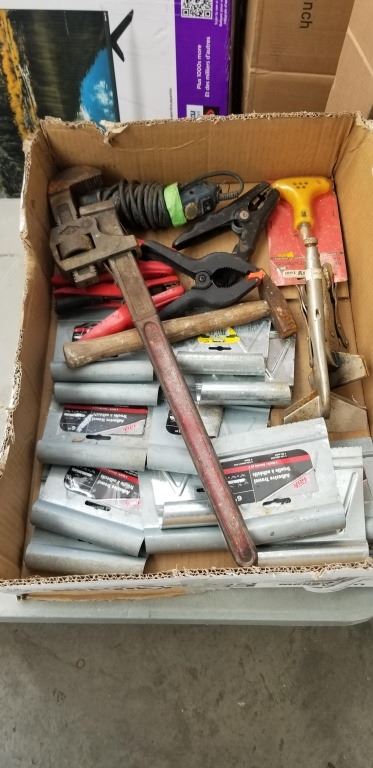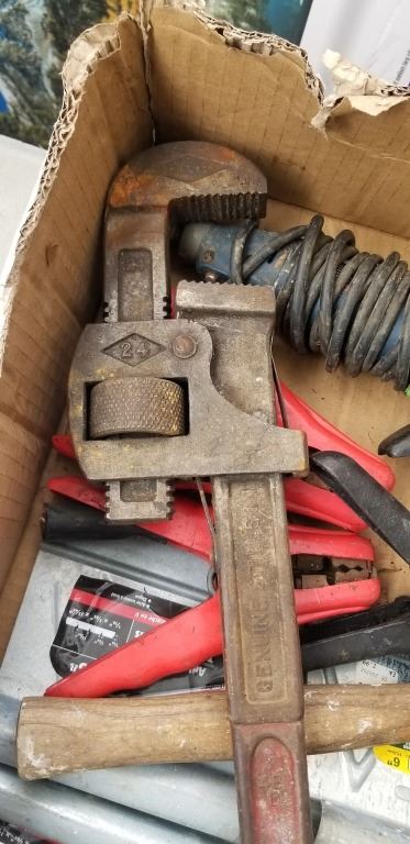 6 INCH ADHESIVE TROWELS, QUICK GRIPS ETC, AND 24 INCH PIPE WRENCH