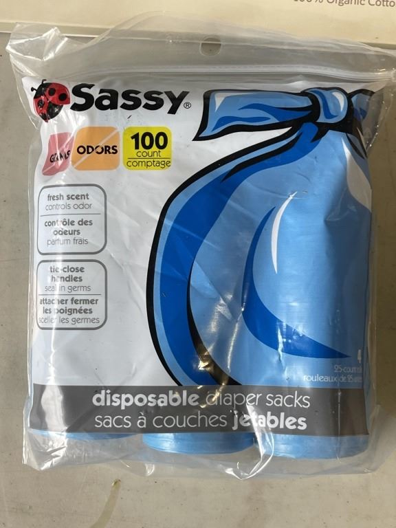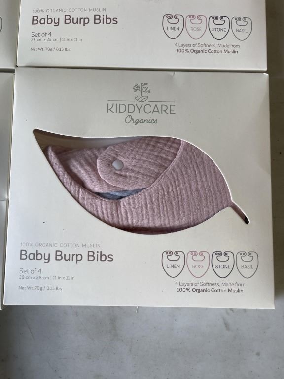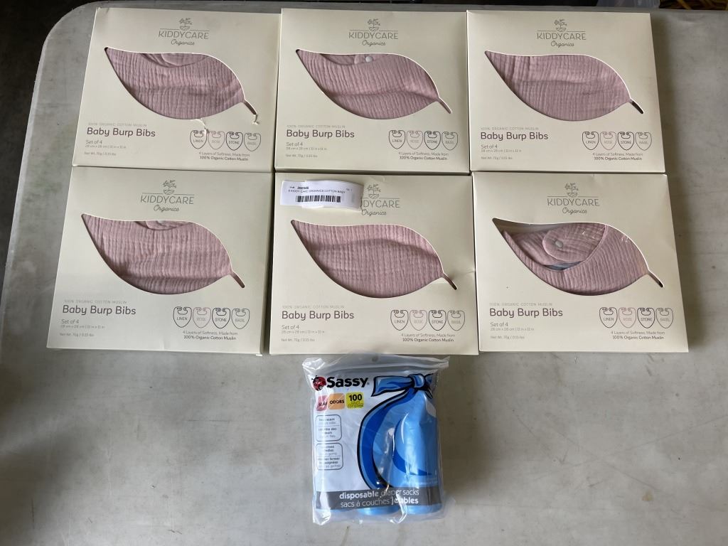 6 KIDDY CARE ORGANICS COTTON BABY BURP BIBS, SET OF 4 AND 100CT DISPOSABLE DIAPER SACKS