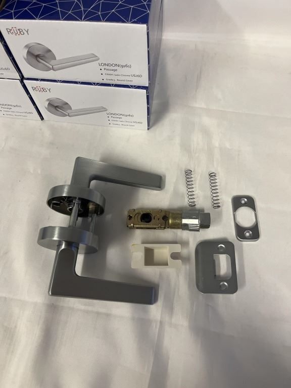 6 NEW DOOR HANDLES, LONDON SATIN CHROME PASSAGE SETS, WITH HARDWARE, GRADE 3