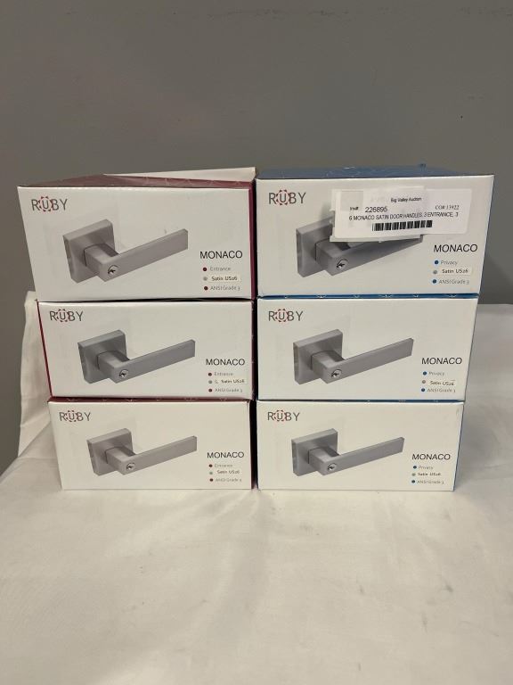 6 NEW DOOR HANDLES, MONACO SATIN, 3 ENTRANCE, 3 PRIVACY, ALL WITH HARDWARE, KEYS WITH ENTRANCE LOCKS, ANSI GRADE 3