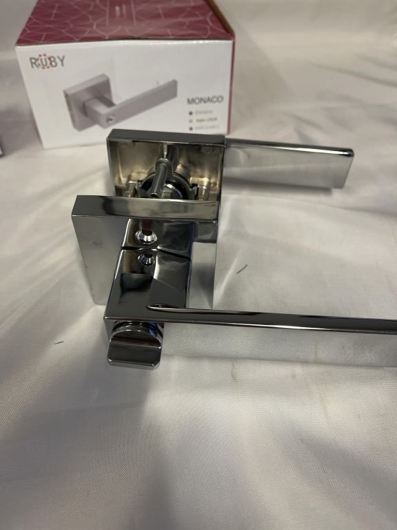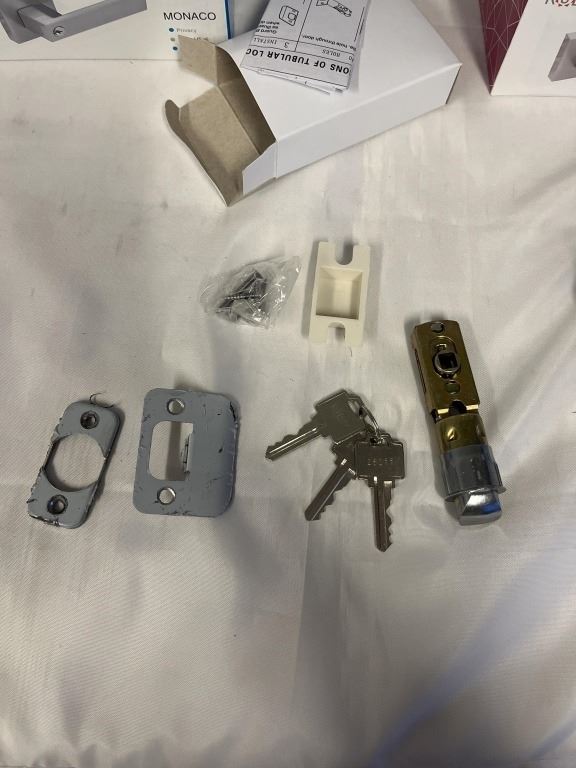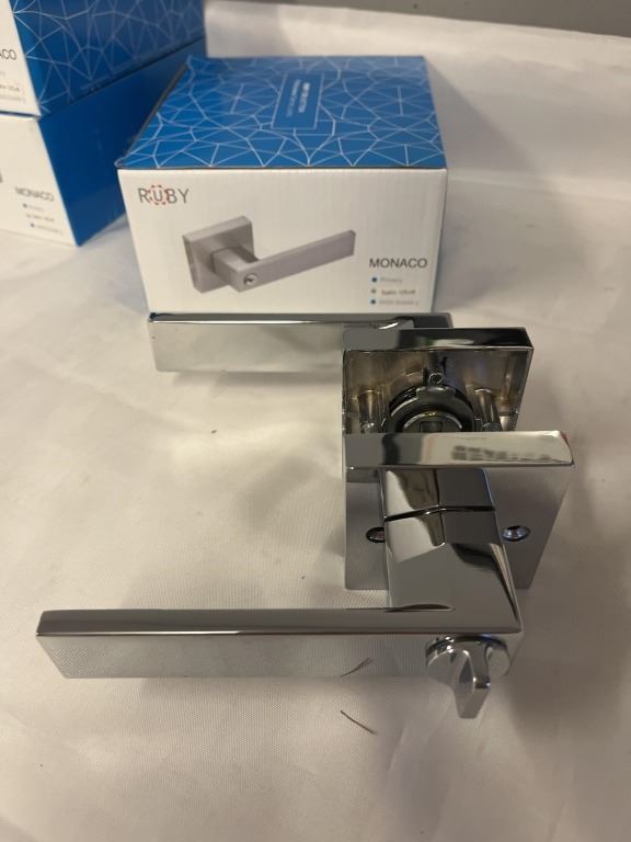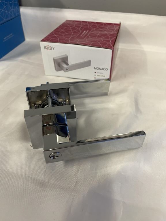 6 NEW DOOR HANDLES, MONACO SATIN, 3 ENTRANCE, 3 PRIVACY, ALL WITH HARDWARE, KEYS WITH ENTRANCE LOCKS