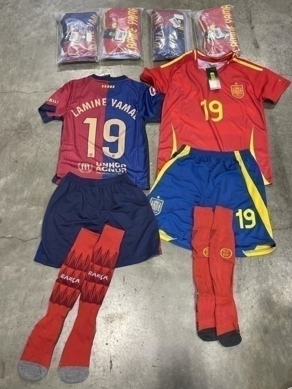 6 NEW 'LAMINE YAMAL' #19 BARCELONA SOCCER UNIFORMS, INCLUDES JERSEY, SHORTS AND SOCKS, 2 SIZE 20, 1 SIZE 22, 1 SIZE 24, 1 SIZE 26, AND ONE SIZE 28, RETAIL $25 EACH, TOTAL $150