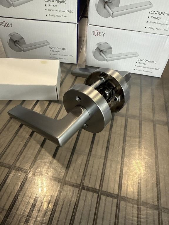 6 NEW LONDON DOOR HANDLES, SATIN CHROME FINISH, GRADE 3, ROUND COVER