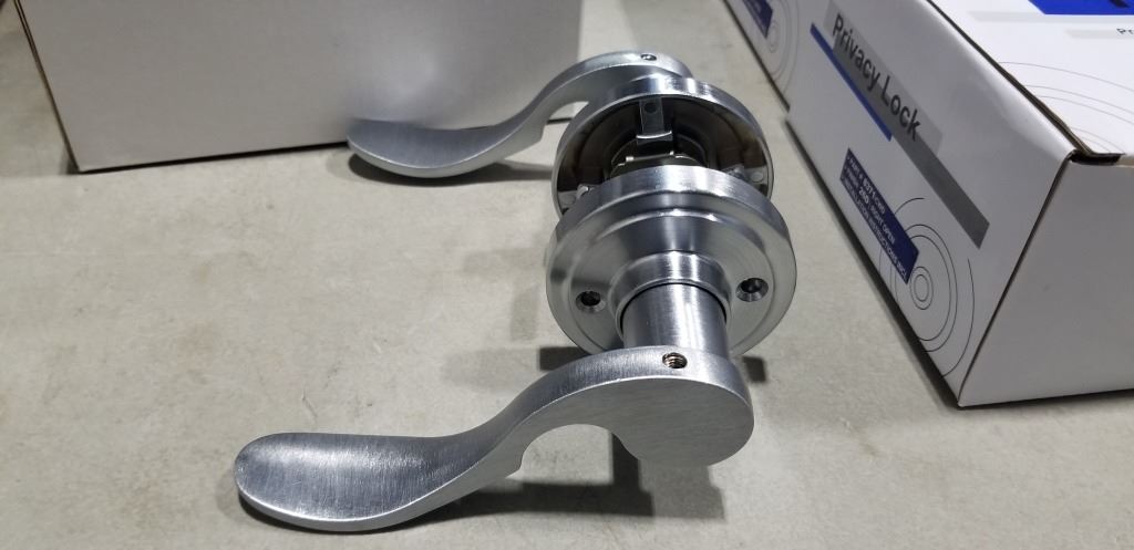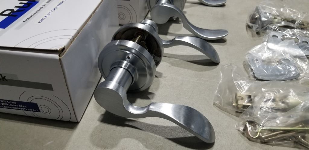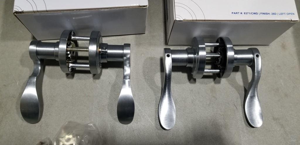 6 NEW PRIVACY LOCKING DOOR HANDLES US26D SATIN FINISH, 3 RIGHT HAND AND 3 LEFT HAND OPEN