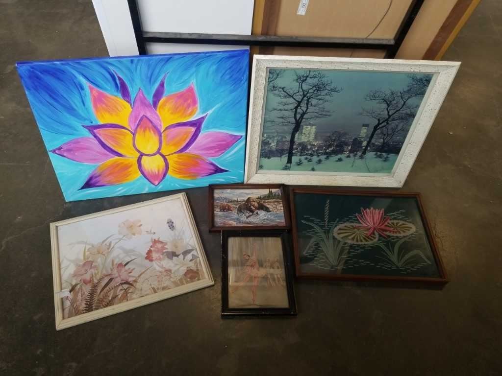 6 PIECES ARTWORK, PRINTS, PAINTING, STITCHED ART