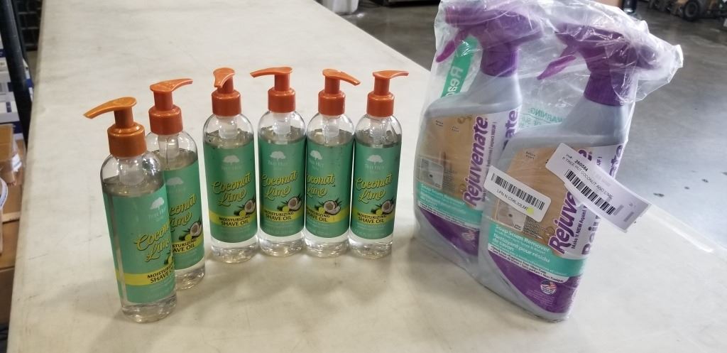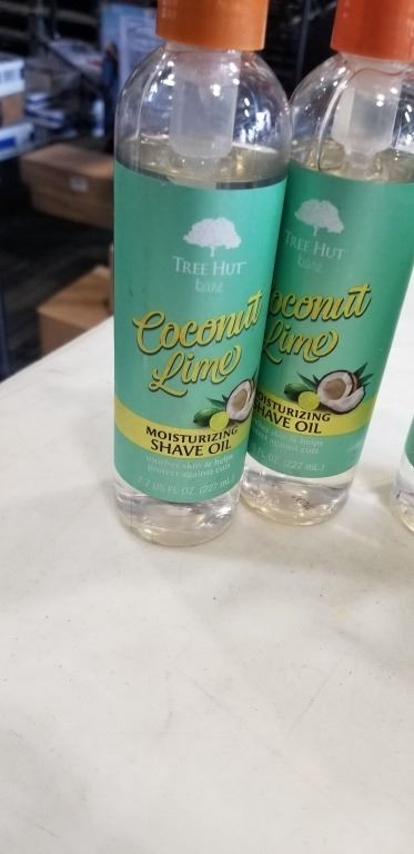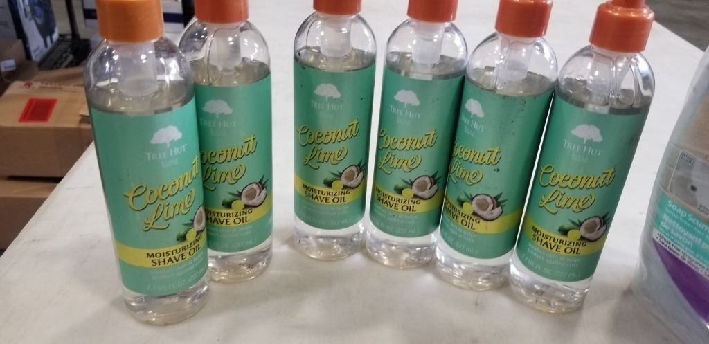6 TREE HUT COCONUT AND LIME MOISTURIZING SHAVE OIL AND 2 BOTTLES OF REJUVENATE SOAP SCUM REMOVER