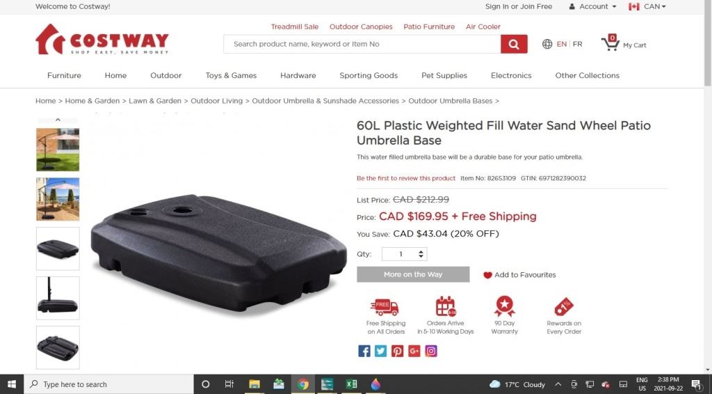 60L Plastic Weighted Fill Water Sand Wheel Patio Umbrella Base