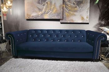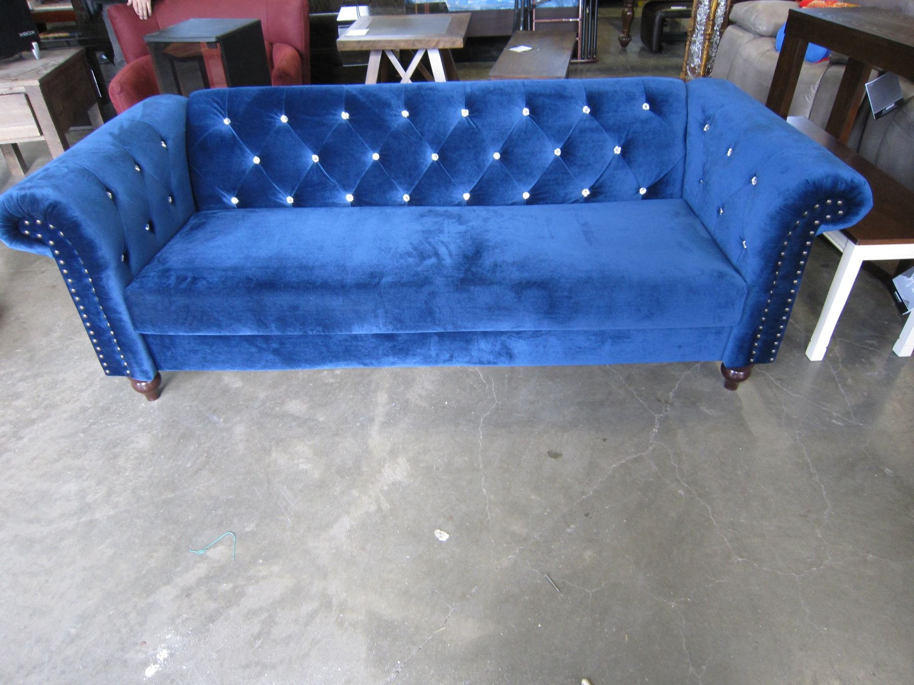 ASHLEY SIGNATURE BLUE VELVETY CLUB STYLE COUCH WITH TUFTED BACK AND NAIL HEAD ACCENTS, RETAIL $1999