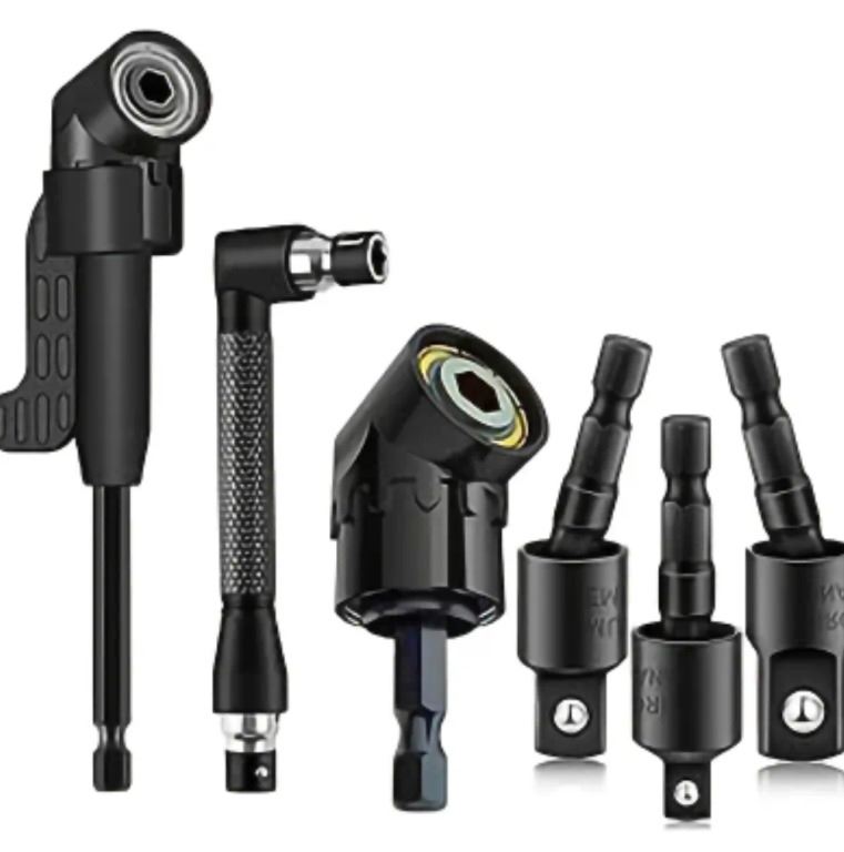 6PCS RIGHT ANGLE DRILL ATTACHMENT SET, INCLUDING 3 360° ROTATABLE 1/4 3/8 1/2" IMPACT GRADE SOCKET ADAPTERS, 2 HEX SHANK 105° ANGLE DRILL ADAPTERS AND 90° BEVEL DRILL BITS