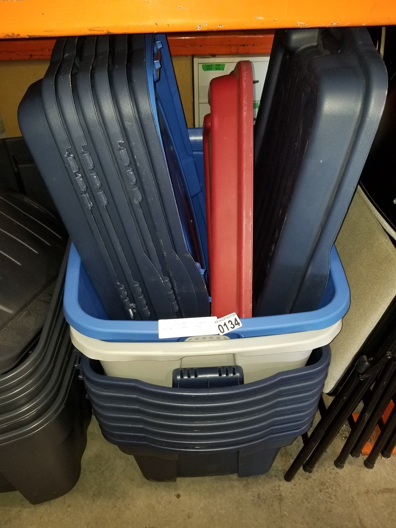 7 100L RUBBERMAID ROUGHNECK TUBES W/ LIDS AND 2 TOTES