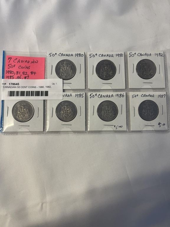 7 CANADIAN 50 CENT COINS - 1980, 1982, 1984, 1985, 1986, 1987