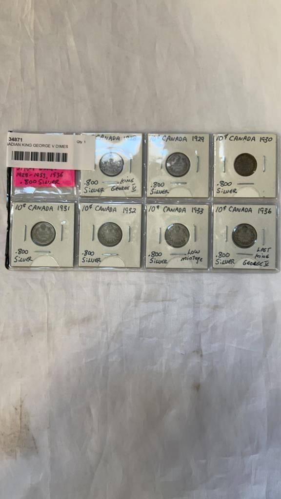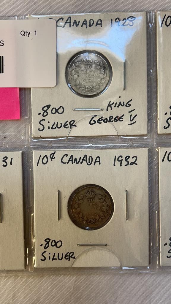 7 CANADIAN KING GEORGE V DIMES 1928-1933, 1936 .800 SILVER
