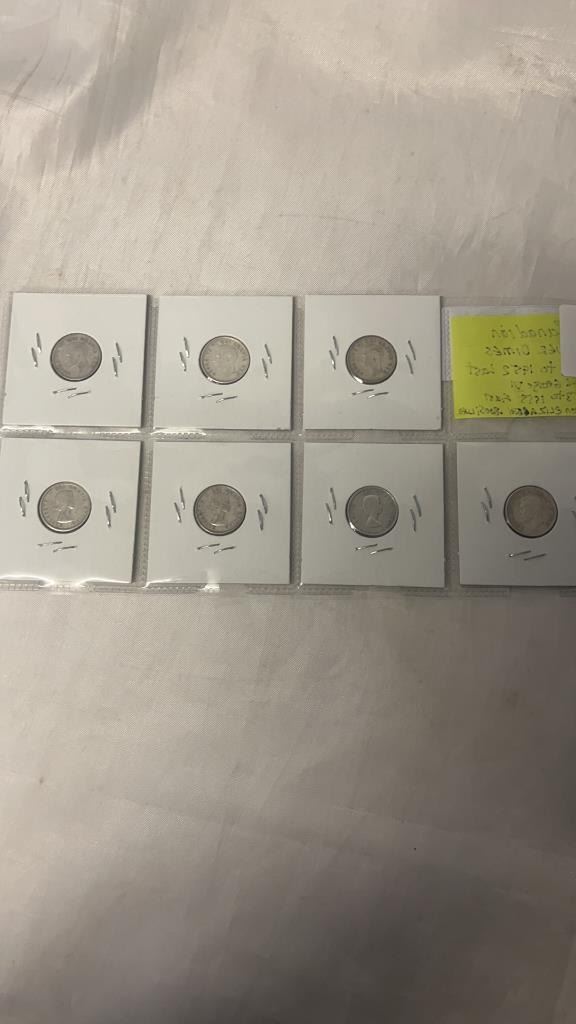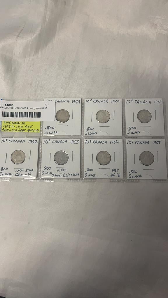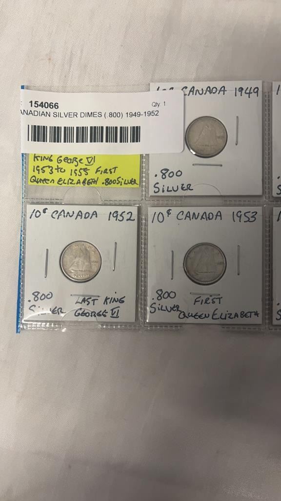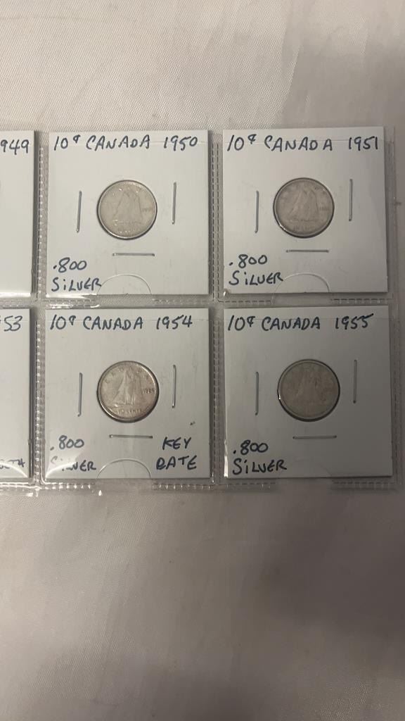 7 CANADIAN SILVER DIMES (.800) 1949-1952 LAST GEORGE VI; 1953-55 FIRST ELIZABETH II