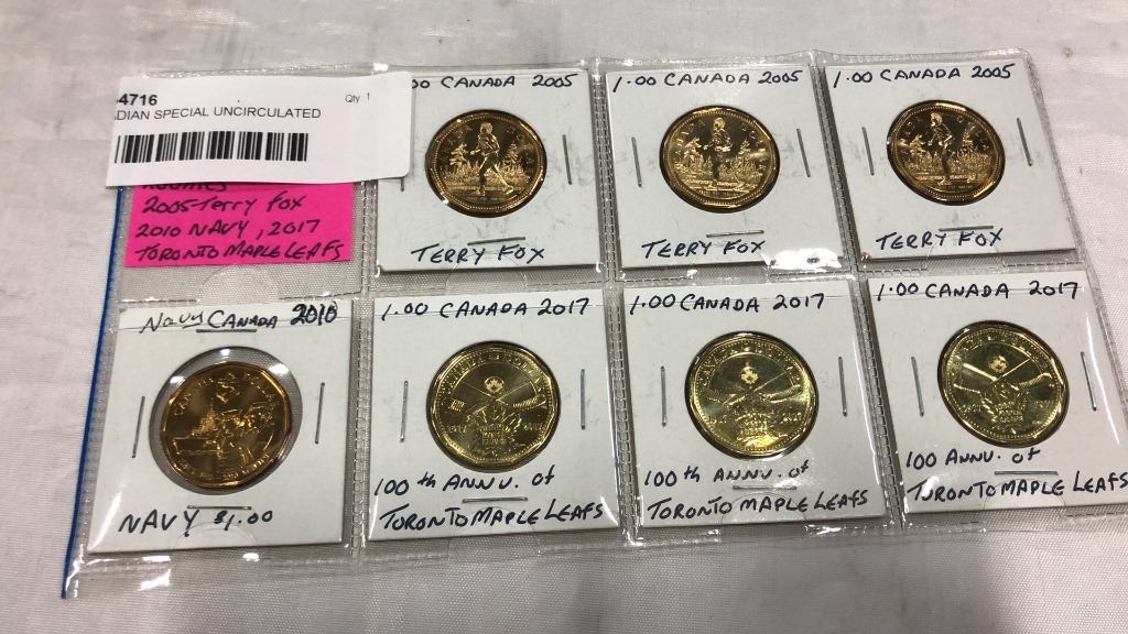 7 CANADIAN SPECIAL UNCIRCULATED LOONIES 3 2005 TERY FOX, 1 2010 NAVY, 3 2017 TORONTO MAPLE LEAFS