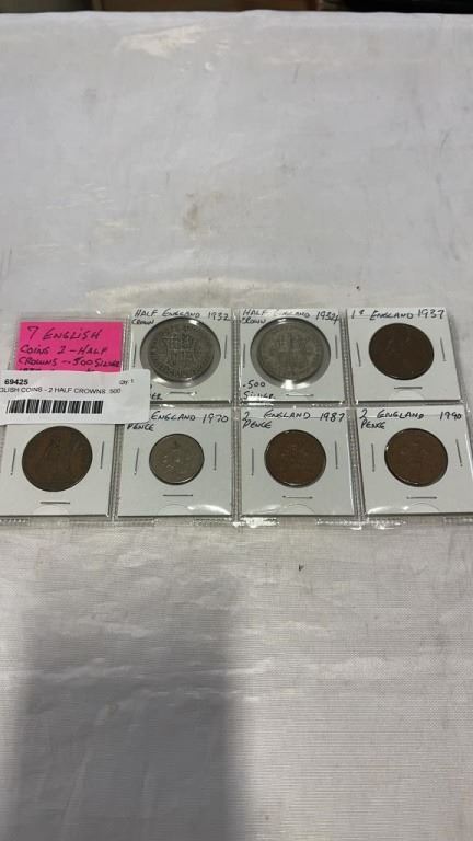 7 ENGLISH COINS - 2 HALF CROWNS .500 SILVER 1937, 1944 CENTS, 5 PENCE, 2 PENCE