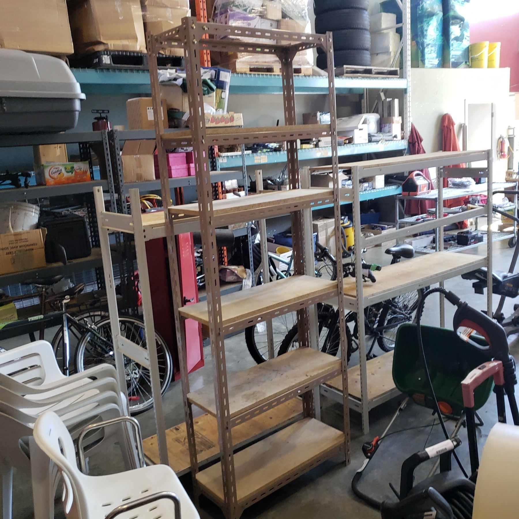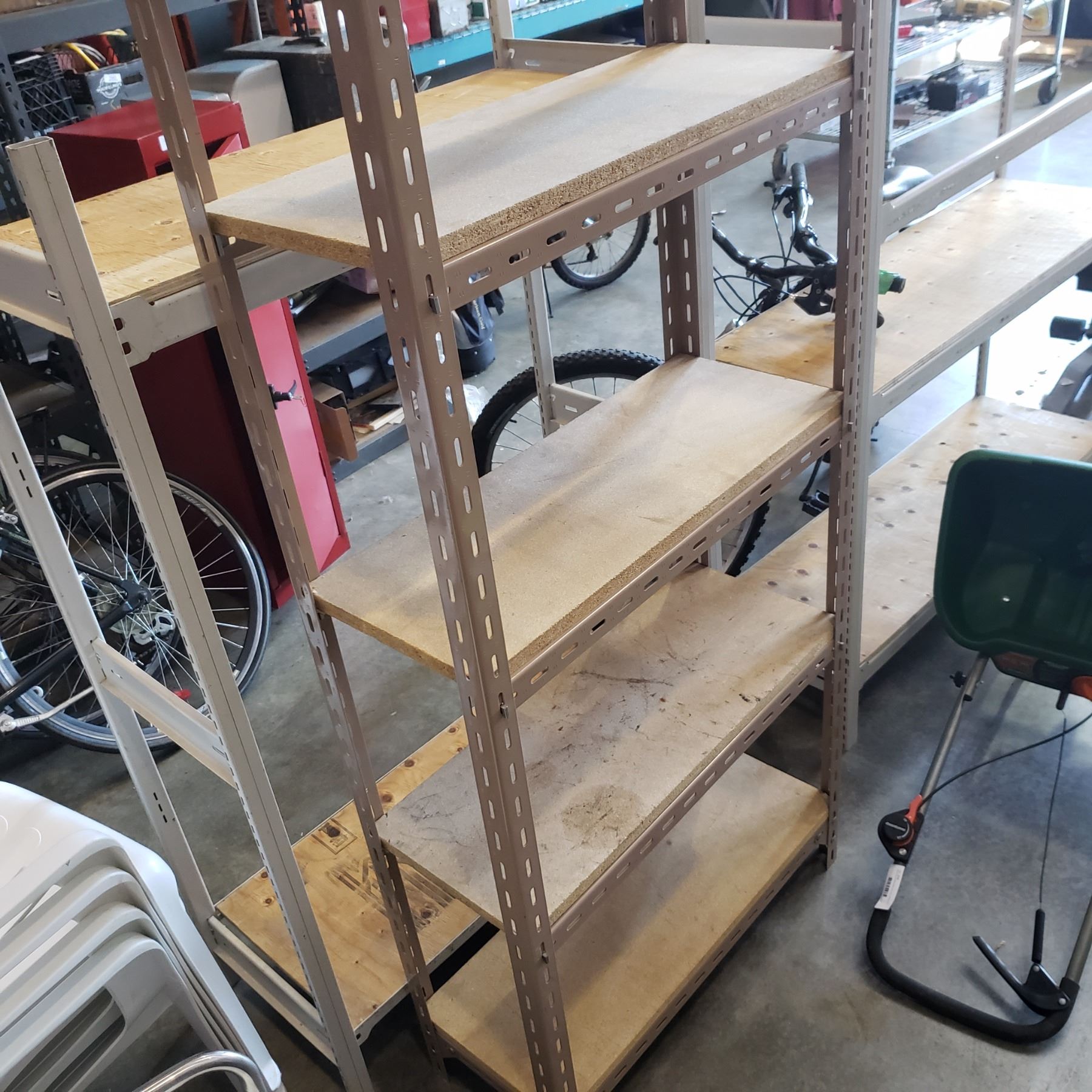 7 FOOT TALL ADJUSTABLE SHELVING UNIT WITH WOOD SHELVES