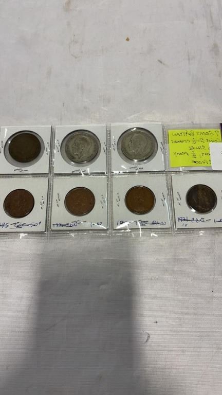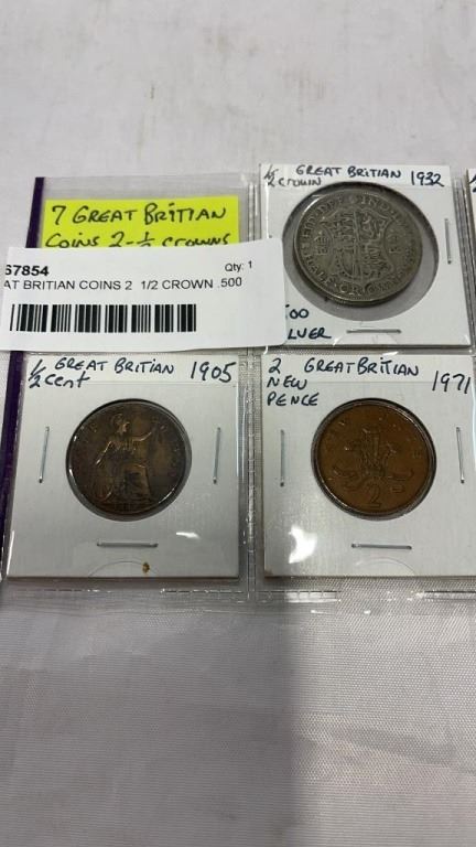 7 GREAT BRITIAN COINS 2 1/2 CROWN .500 SILVER, 1 PENNY, 1/2 PENNY, AND 3 NEW PENCE