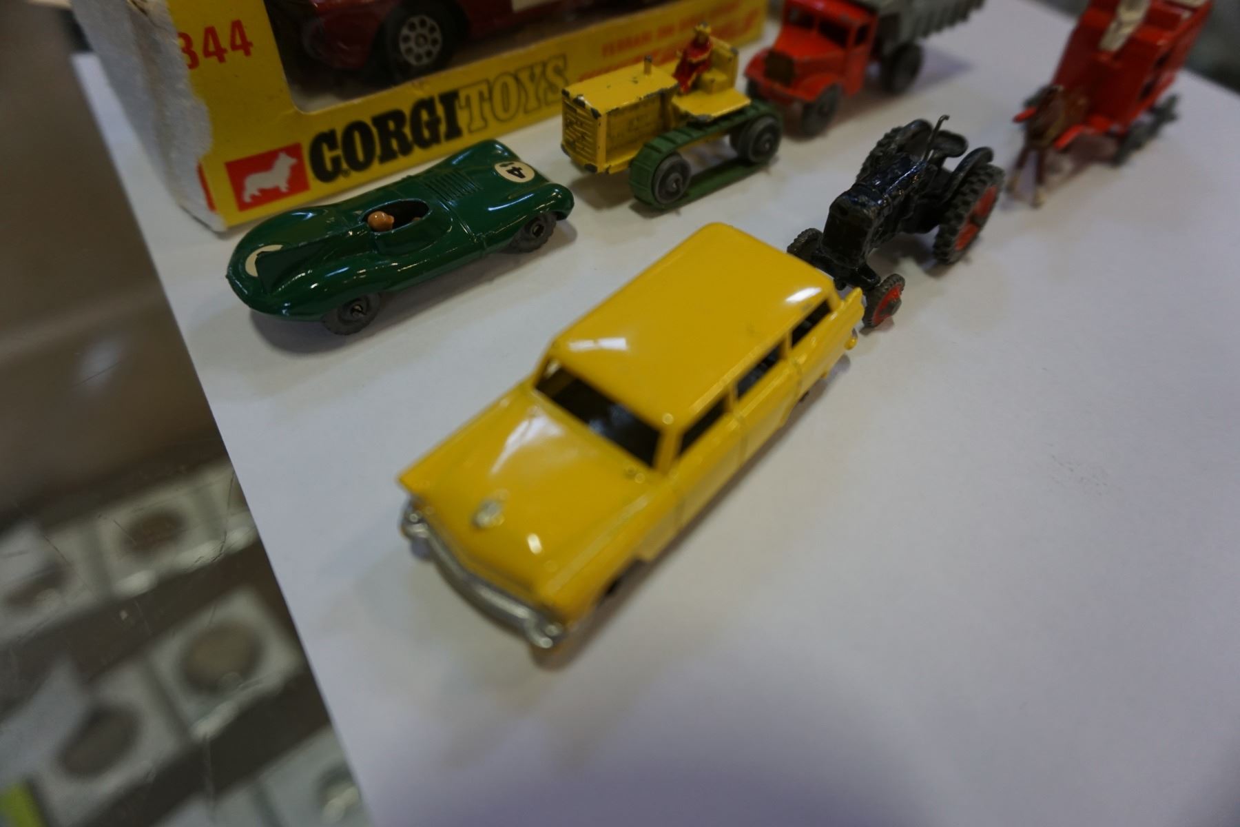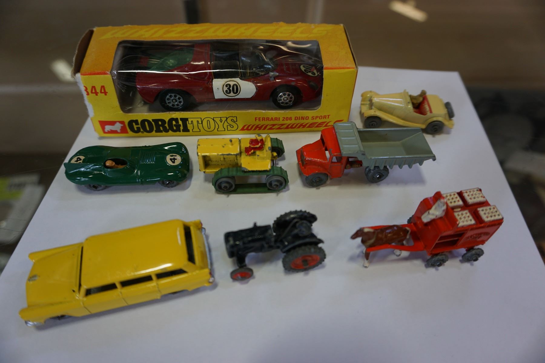 7 LESNEY MADE IN ENGLAND METAL TOY CARS, TRACTORS AND 1 CORGI TOYS WHIZZWHEELS TOY CAR IN BOX