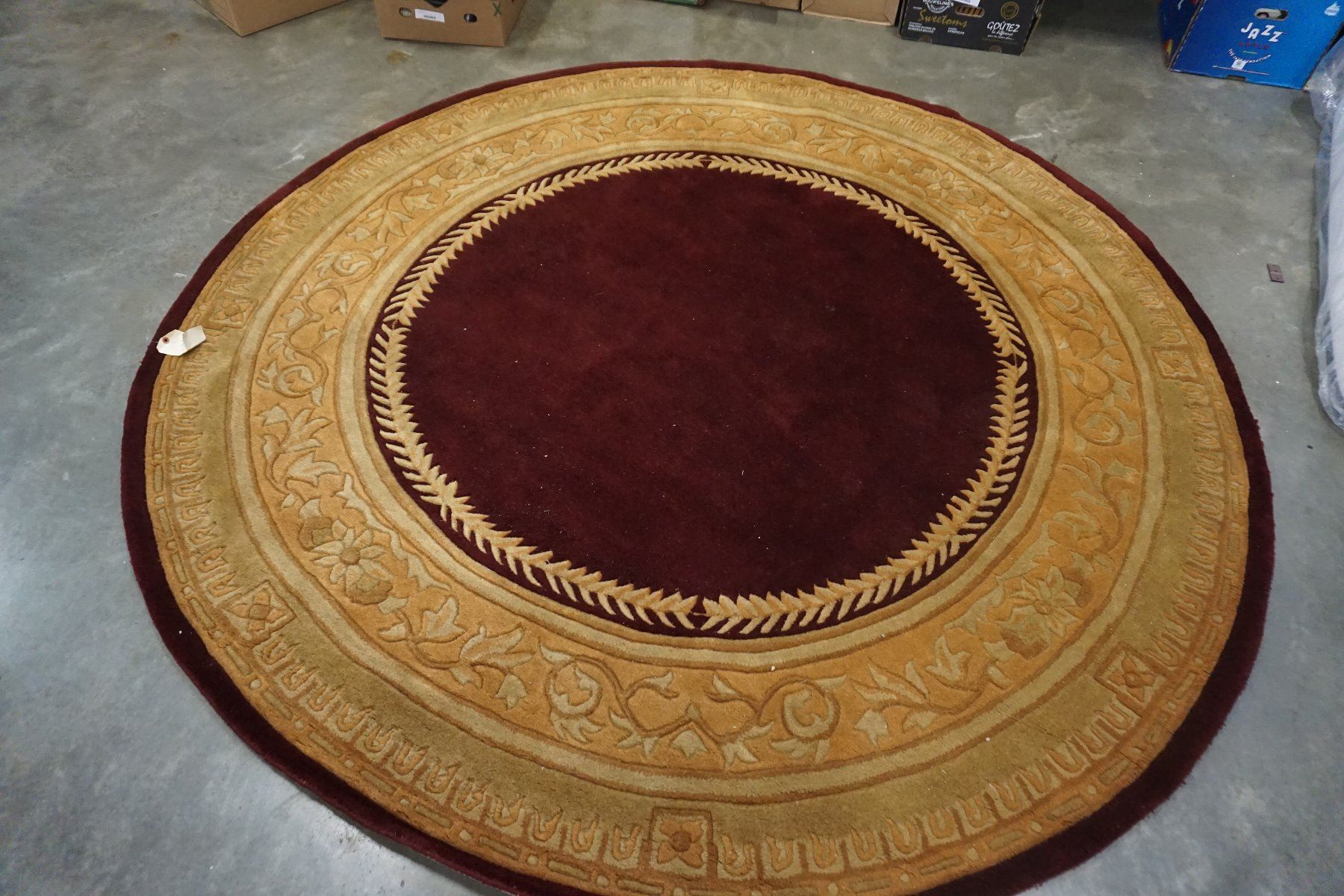 8 FOOT ROUND HAND TUFTED WOOLEN RUG BURGUNDY AND GOLD