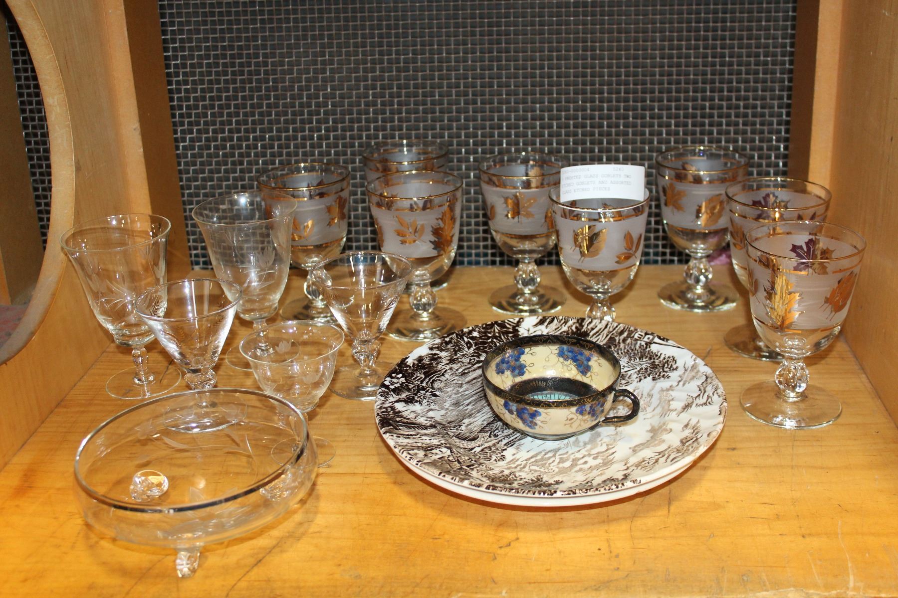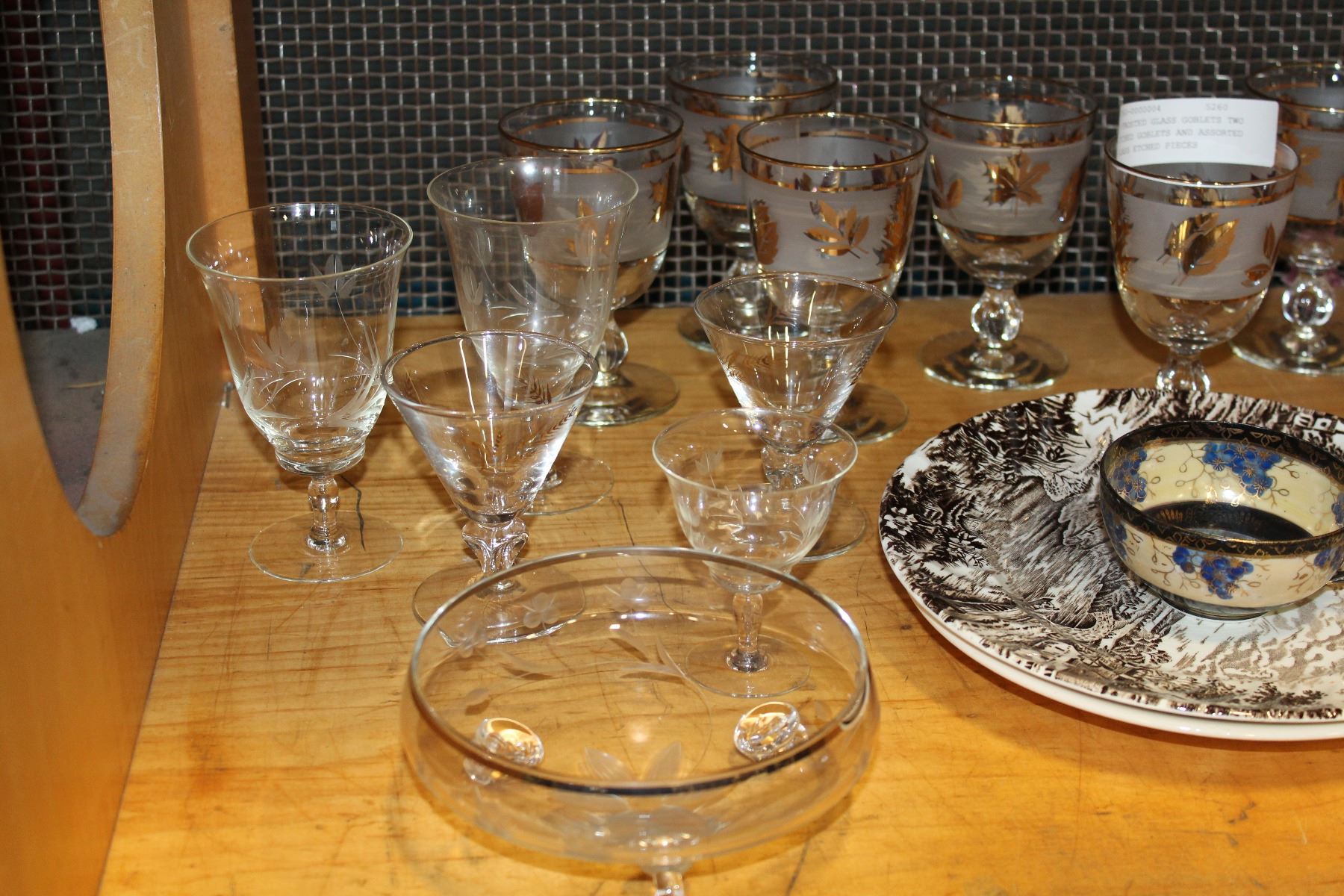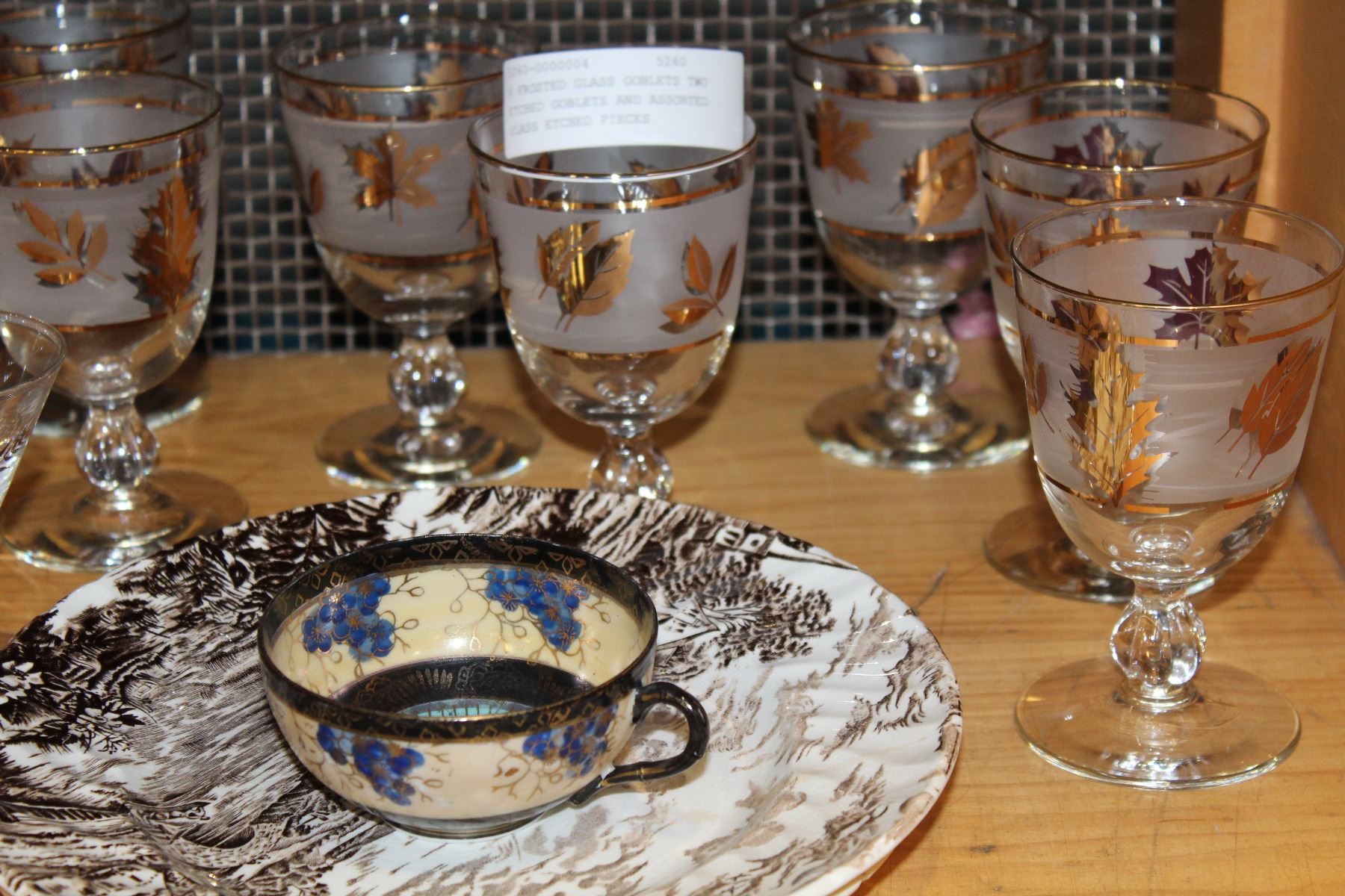 8 FROSTED GLASS GOBLETS TWO ETCHED GOBLETS AND ASSORTED GLASS ETCHED PIECES