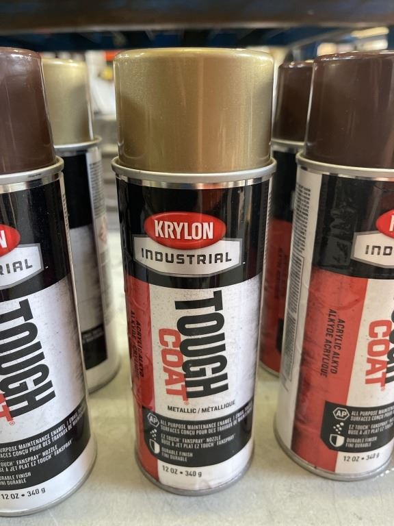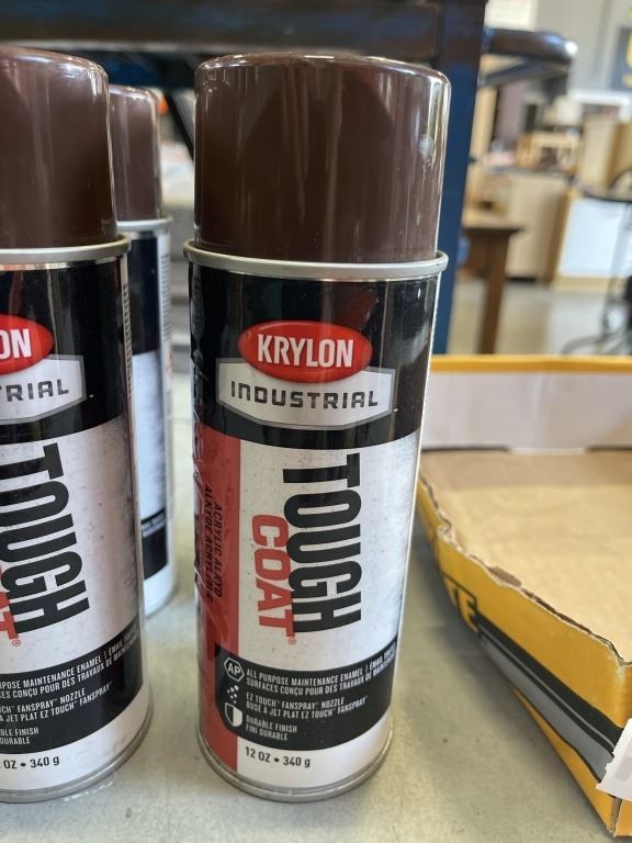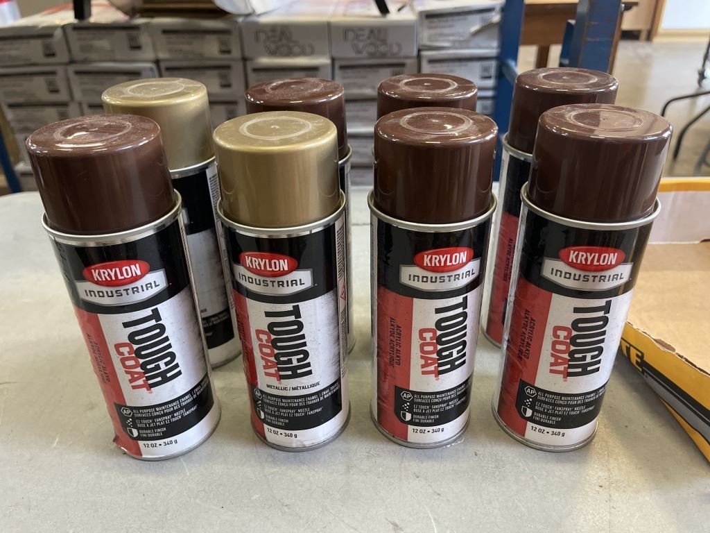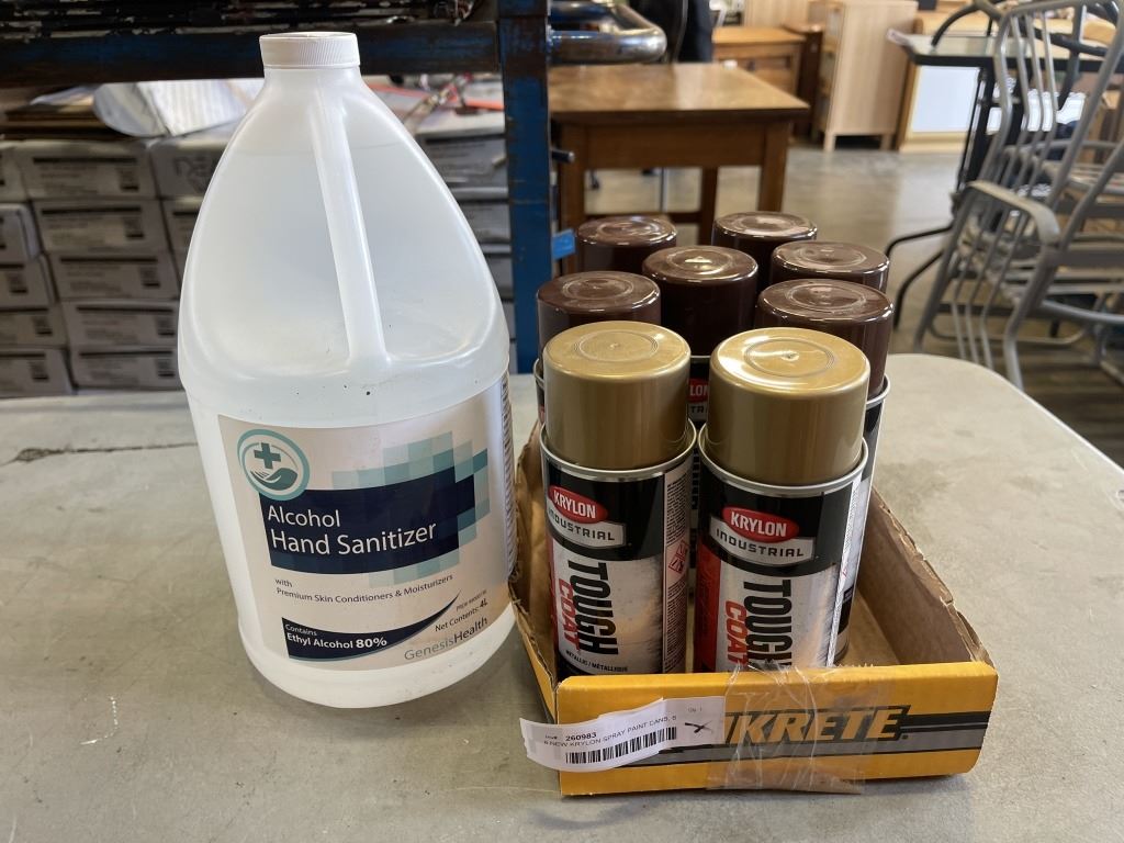 8 NEW KRYLON SPRAY PAINT CANS, 6 BROWN, 2 GOLD AND ALCOHOL HAND SANITIZER