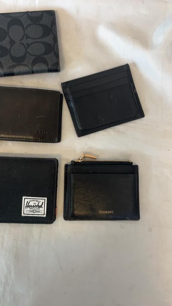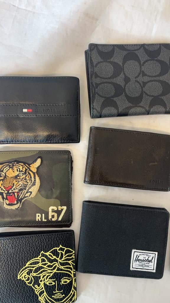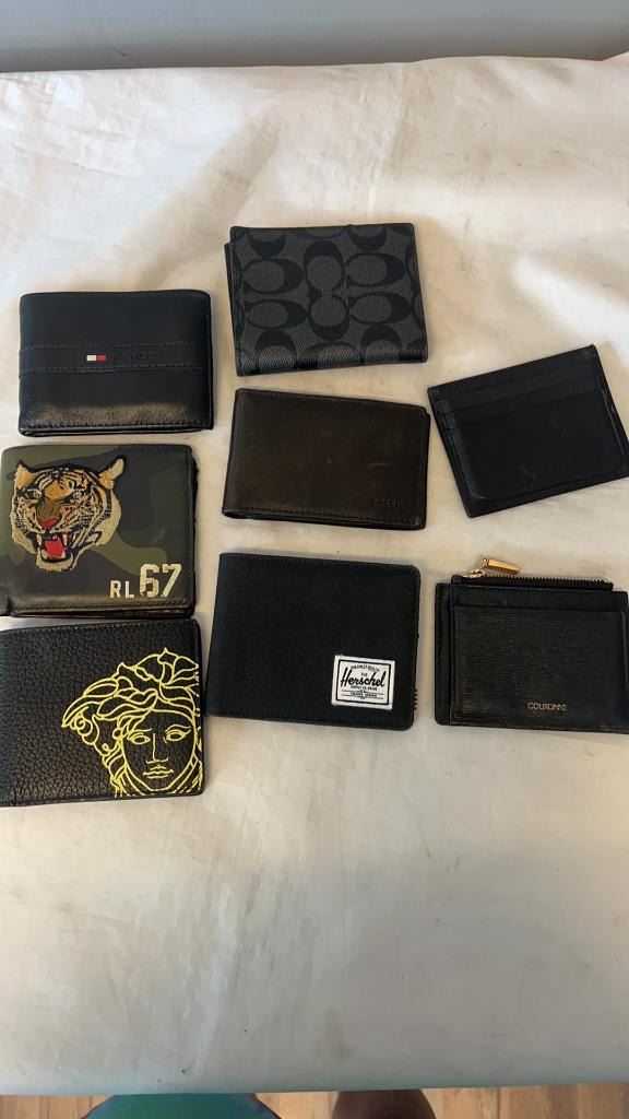 8 UNAUTHENTICATED DESIGNER MENS WALLETS - VERSACE, COACH, HERSCHEL, TOMMY HILFIGER, ETC
