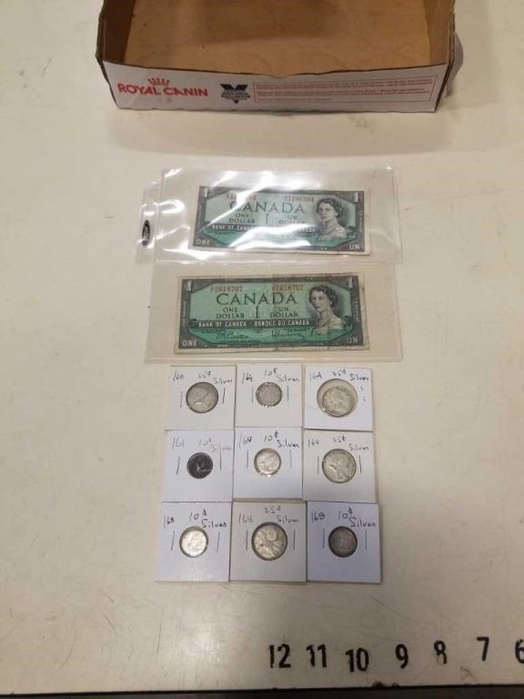 .800 SILVER DIMES AND QUARTERS1961-1968 VARIOUS DATES AND TWO 1954 CANADIAN DOLLARS