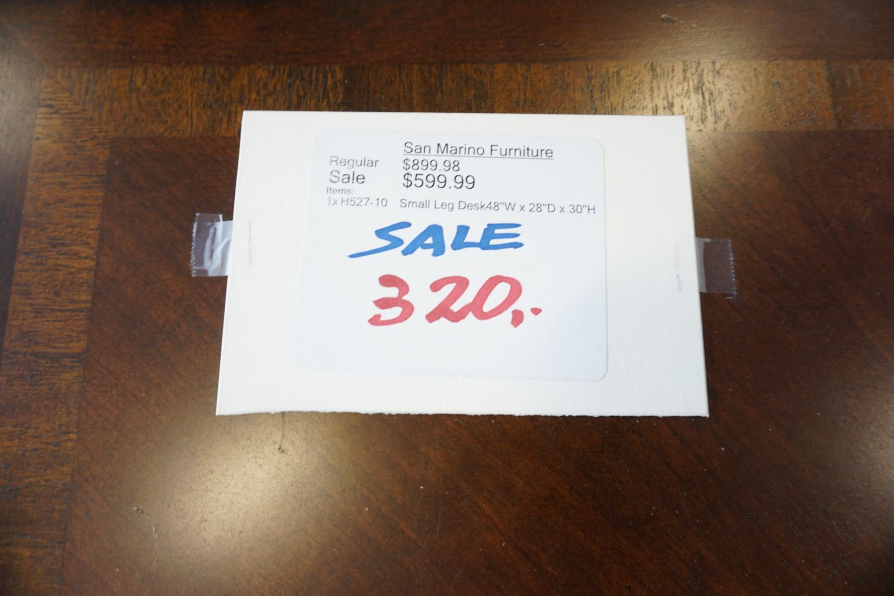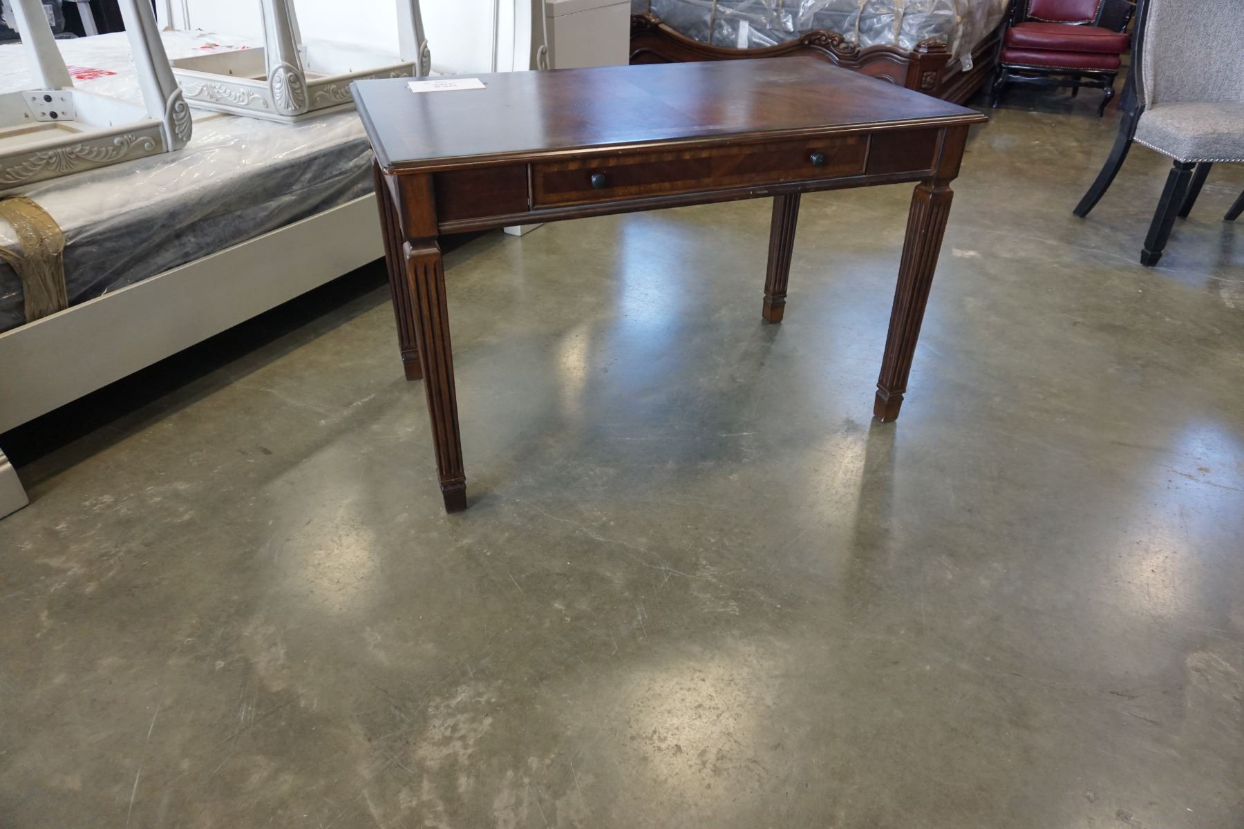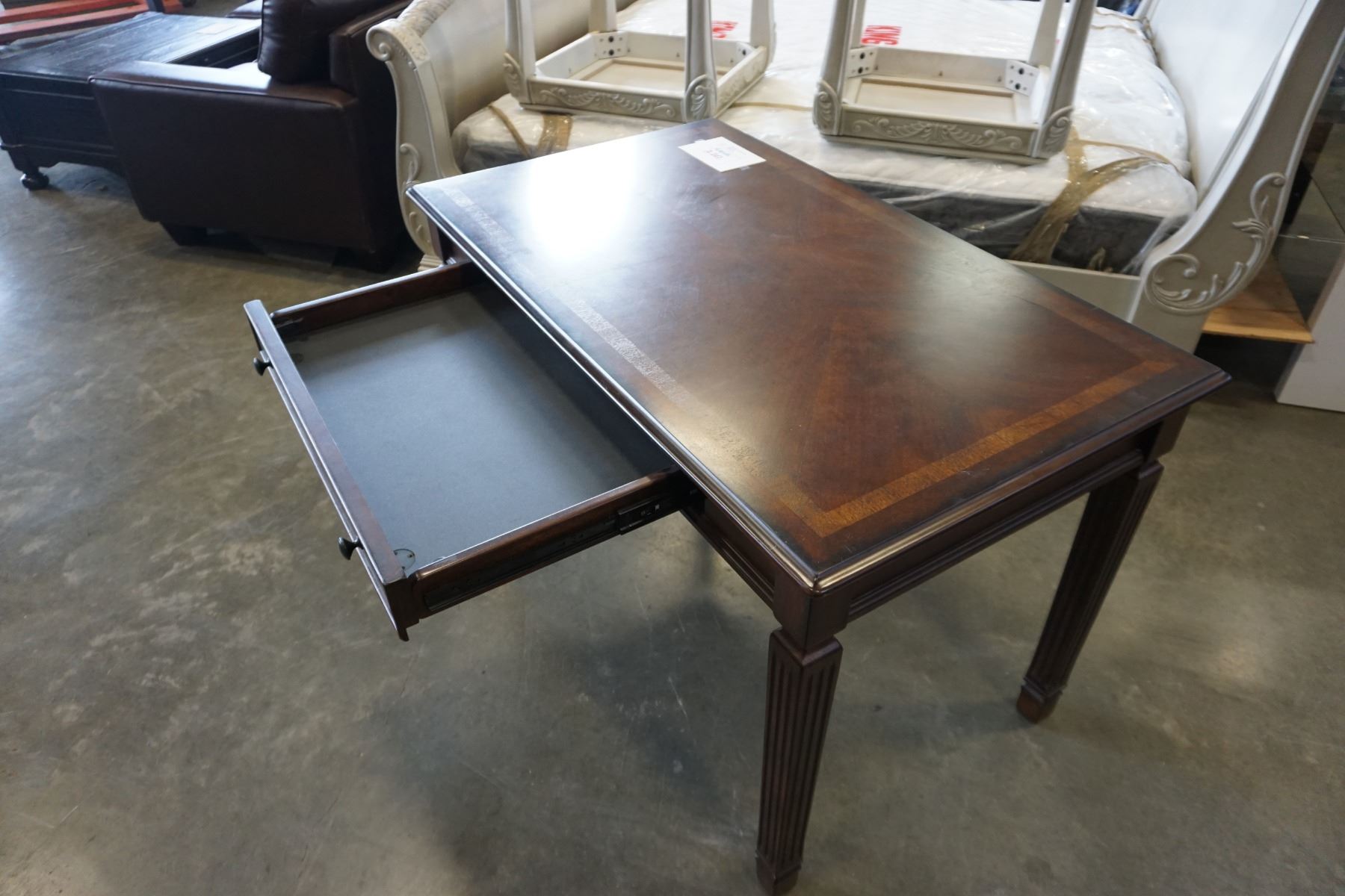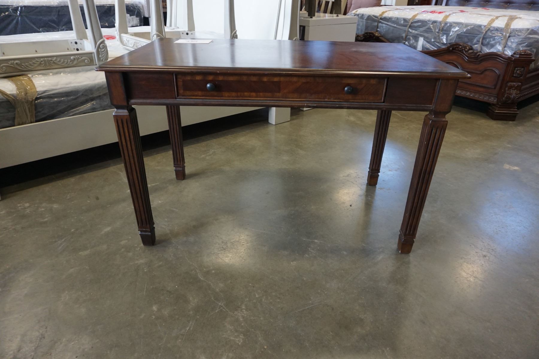 ASHLEY FLOOR MODEL DARK FINISH OPEN LEG DESK WITH LARGE KEYBOARD TRAY, AND MATCHING CHAIR, RETAIL $699