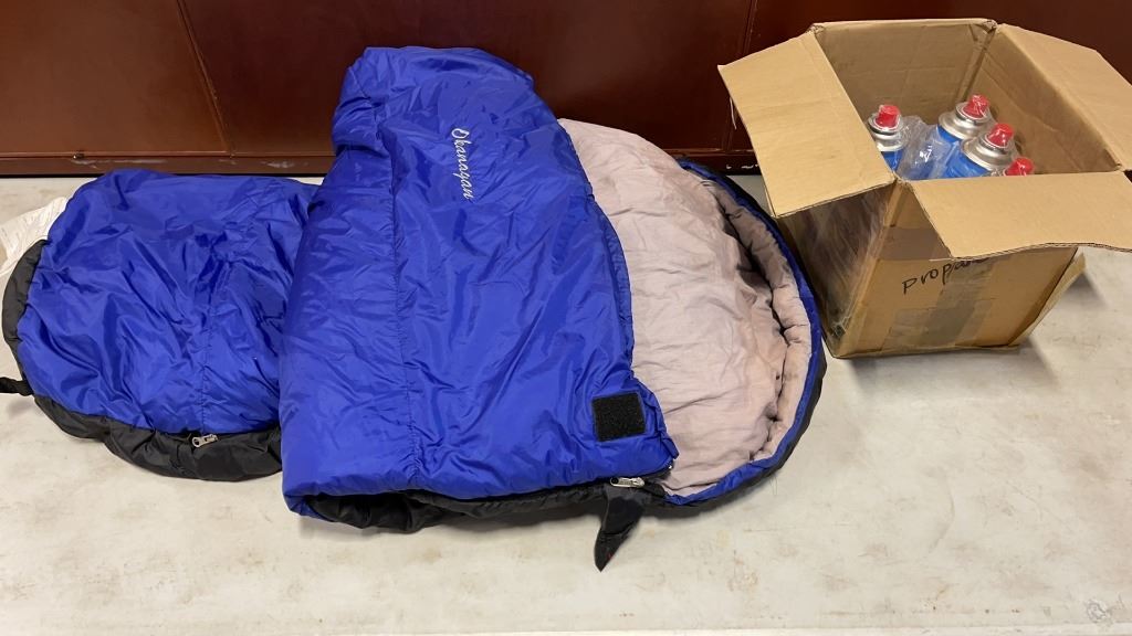 9 BUTANE GAS CANS AND SLEEPING BAG