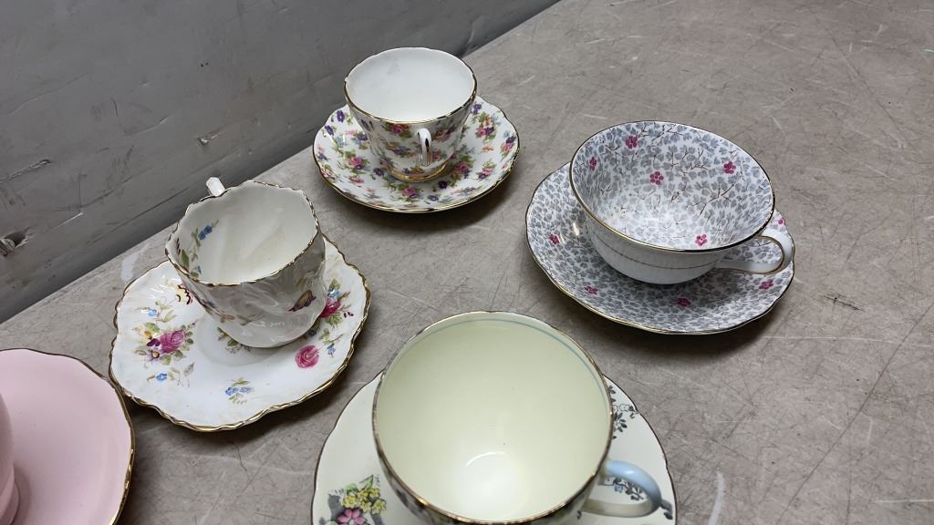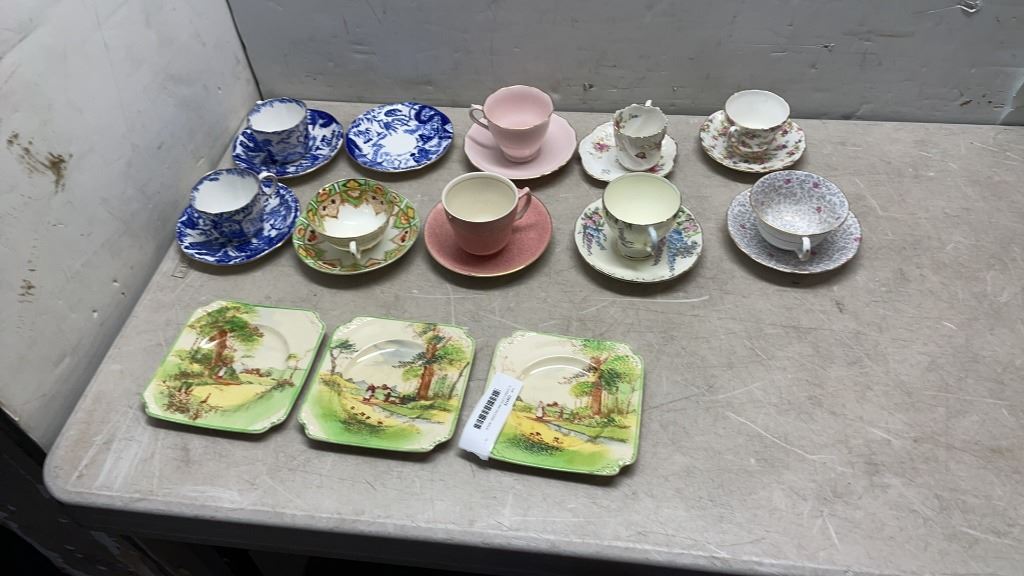 9 CHINA CUPS AND SAUCERS: WADE, ROYAL CROWN DERBY AND MORE WITH 3 ROYAL DOULTON PLATES