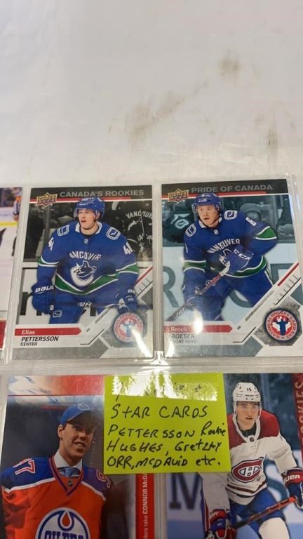 9 ROOKIE AND STAR HOCKEYCARDS HUGHES, PETTERSSON, GRETZKY, ORR, ETC
