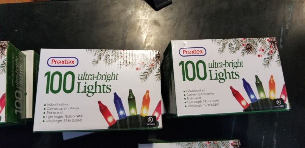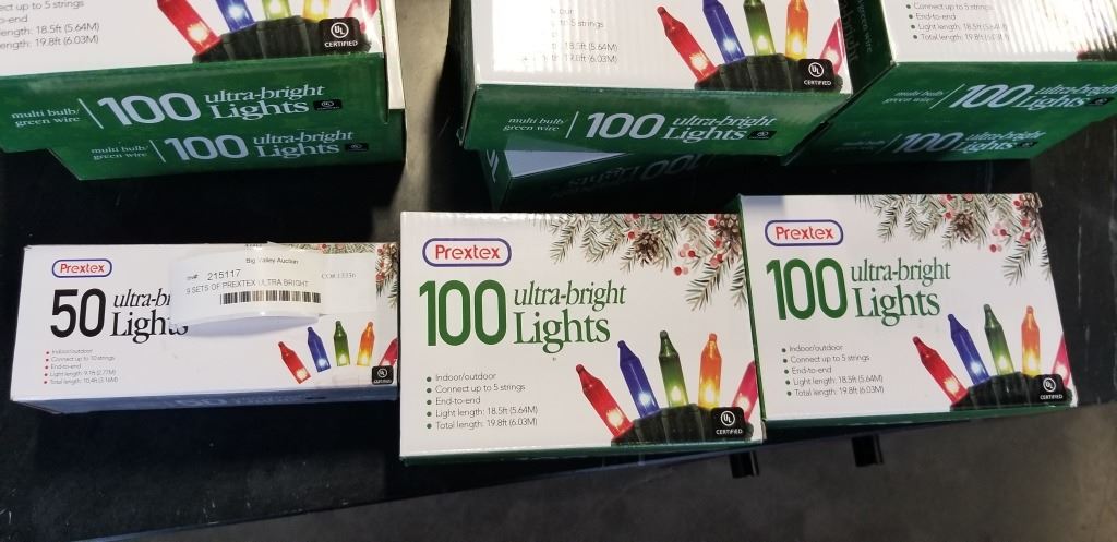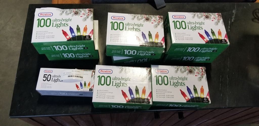 9 SETS OF PREXTEX ULTRA BRIGHT INDOOR/OUTDOOR HOLIDAY LIGHTS, 8 PACKS OF 100, AND ONE PACK OF 50