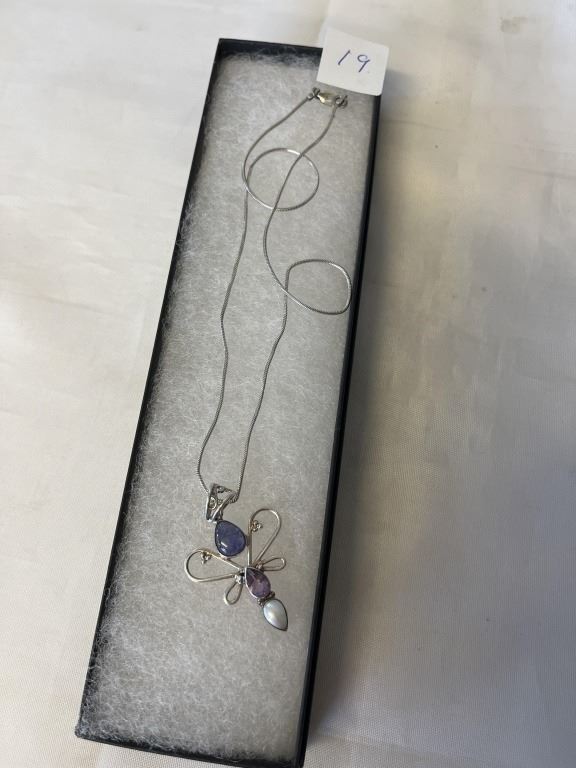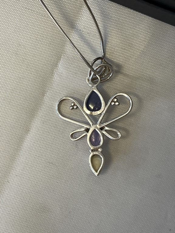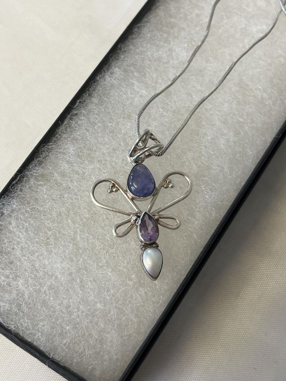 925 ITALIAN STERLING SILVER CHAIN WITH LARGE 925 PENDANT WITH GENUINE BLUE STONE, AMETHYST AND PEARL 16" LENGTH
