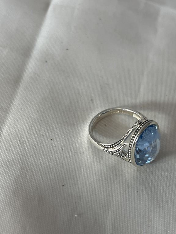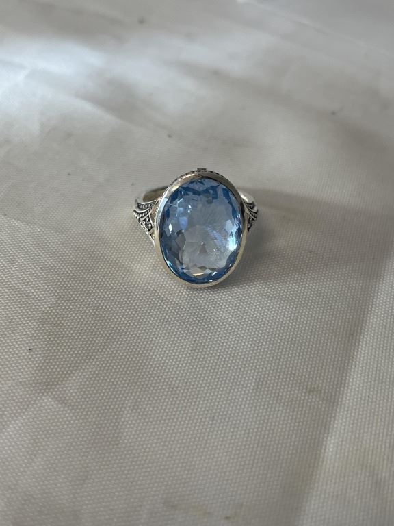 925 STERLING SILVER W/ FACETED BLUE STONE POSSIBLE AQUAMARINE RING GOOD CONDITION