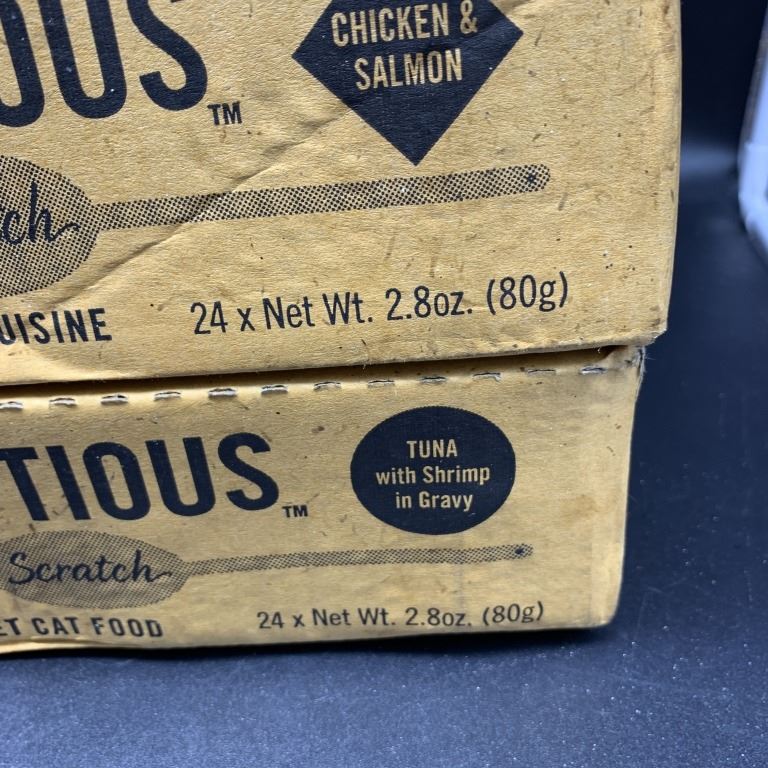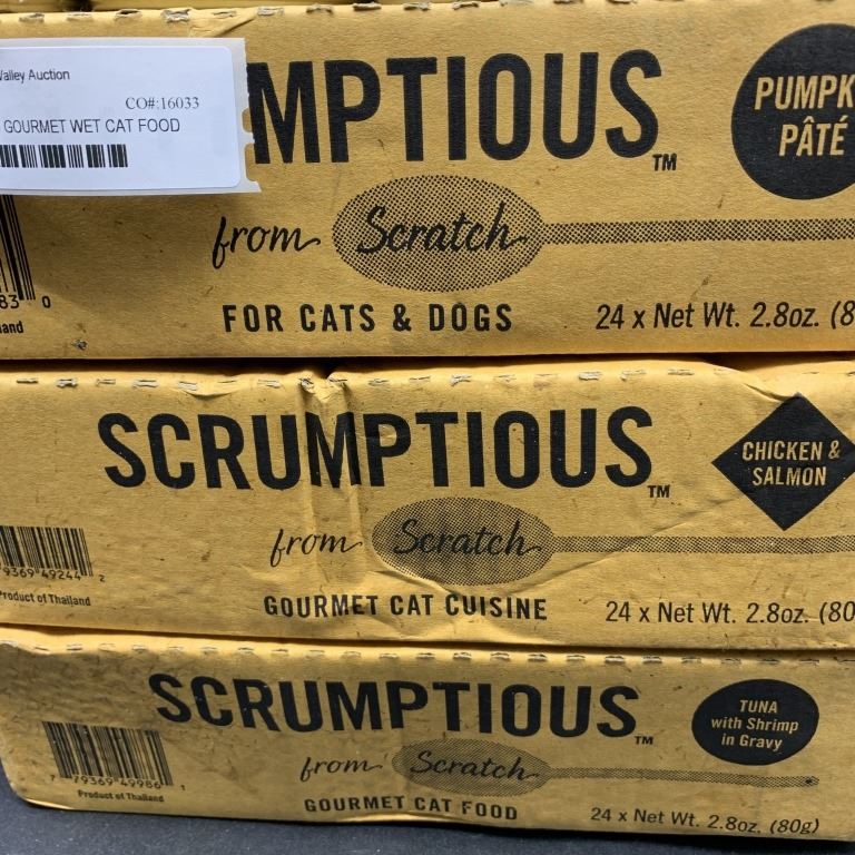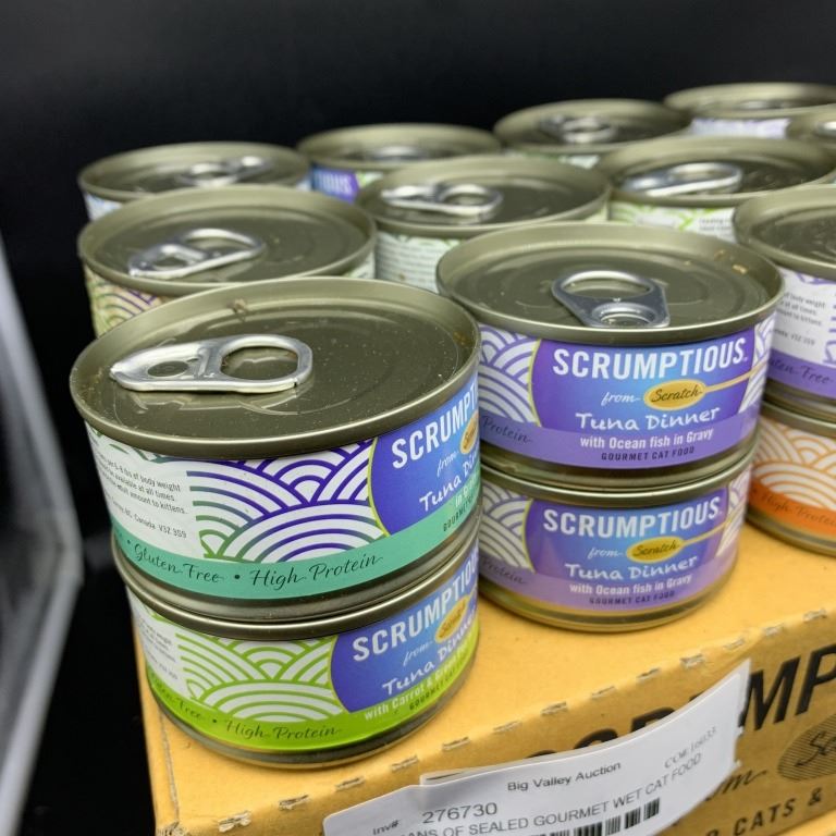 96 CANS OF SEALED SCRUMPTIOUS GOURMET WET CAT FOOD ASSORTED FLAVORS