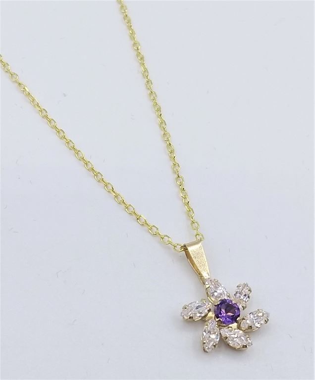 9KT YELLOW GOLD 3MM GENUINE AMETHYST AND CZ PENDANT W/ YELLOW GOLD PLATED STERLING CHAIN W/ APPRAISAL $300 - 0.51CTS AMETHYST BIRTHSTONE FEBRUARY
