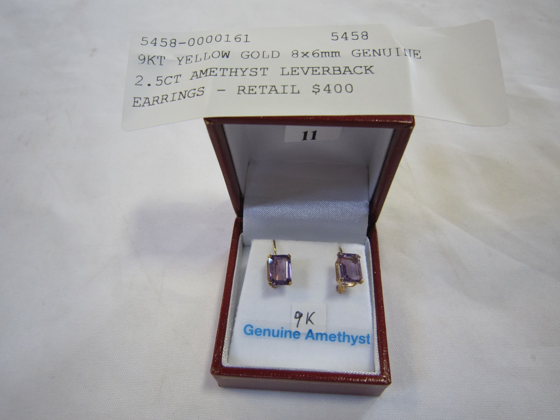 9KT YELLOW GOLD 8x6mm GENUINE 2.5CT AMETHYST LEVERBACK EARRINGS - RETAIL $400