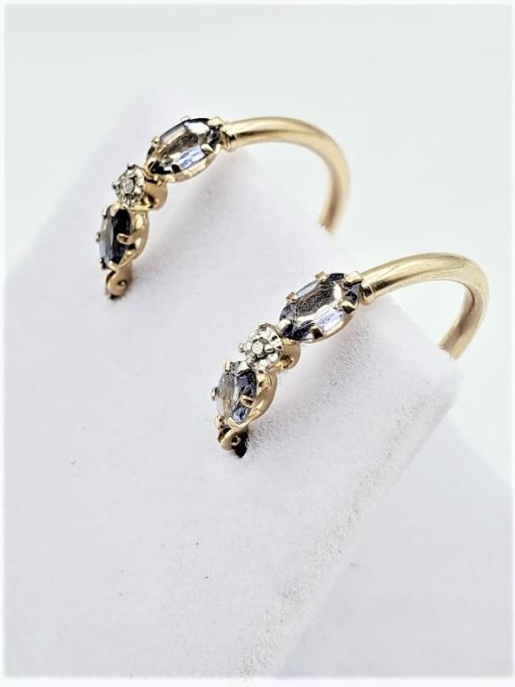 9KT. YELLOW GOLD NATURAL IOLITE & DIAMOND HOOP EARRINGS, RETAIL $500.00