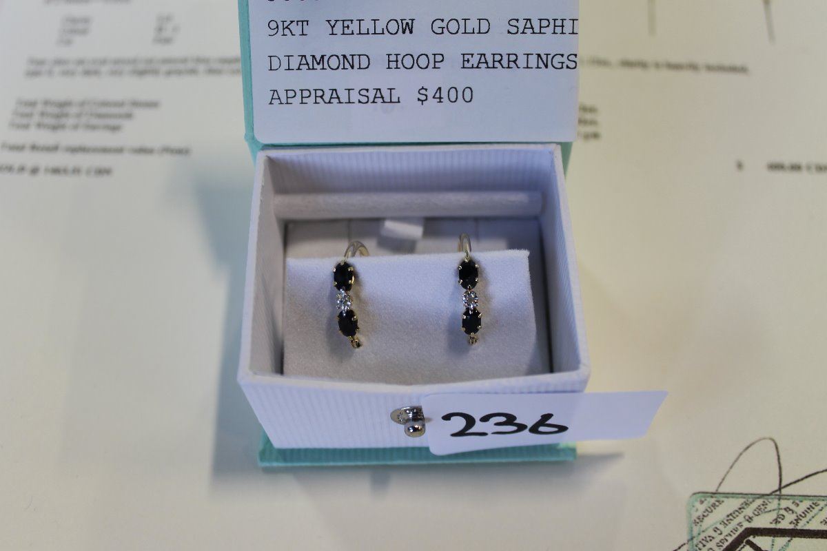 9KT YELLOW GOLD SAPHIRE AND DIAMOND HOOP EARRINGS WITH