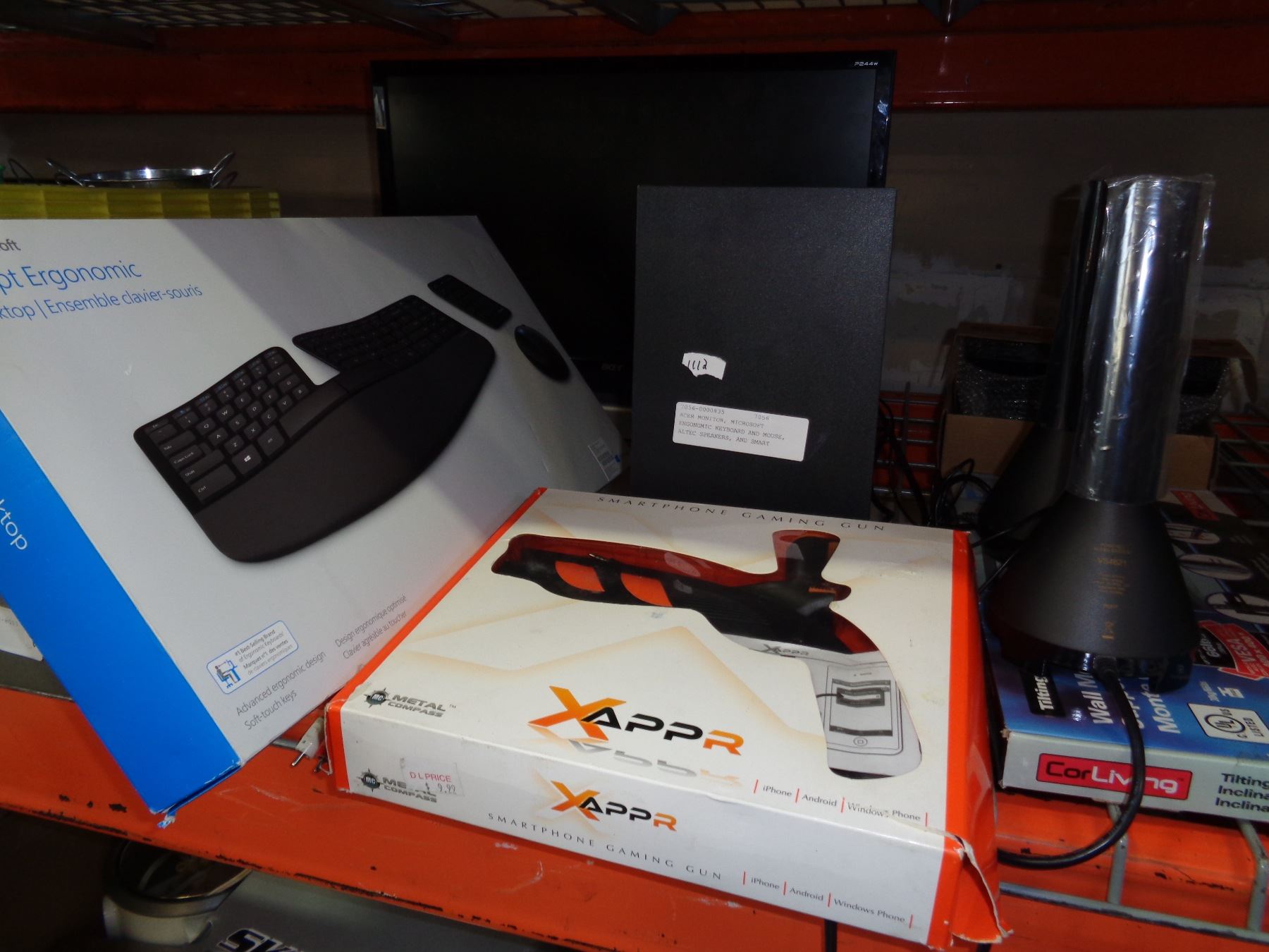 ACER MONITOR, MICROSOFT ERGONOMIC KEYBOARD AND MOUSE, ALTEC SPEAKERS, AND SMART PHONE GAMING