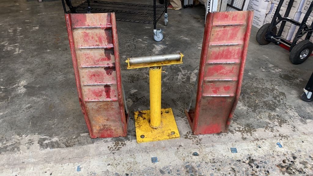 ADJUSTABLE HEIGHT ROLLER STAND AND PAIR OF METAL CAR MAINTENANCE RAMPS