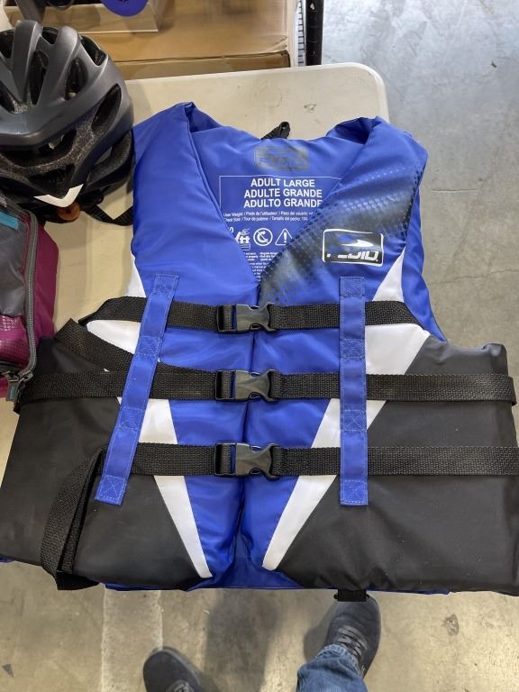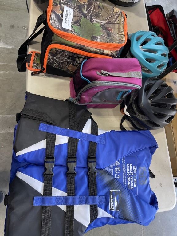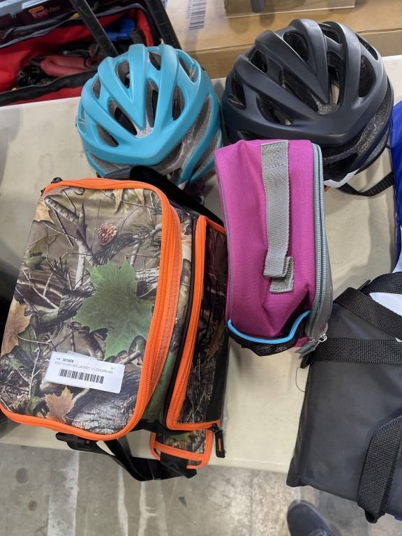 ADULT FLUID LIFE JACKET, 2 COOLERS AND PAIR OF HELMETS