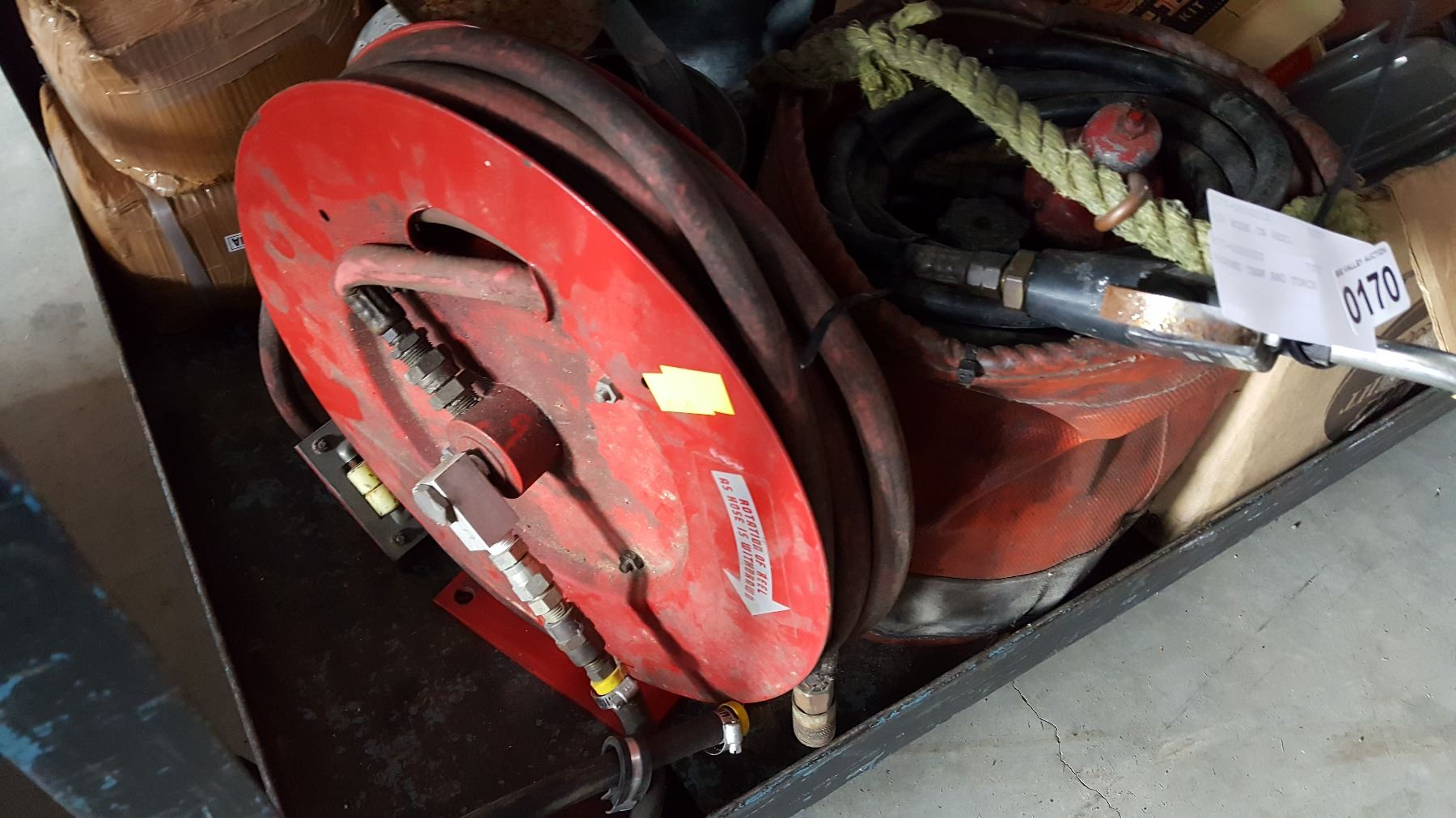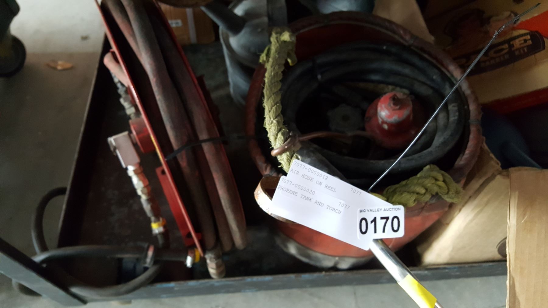 AIR HOSE ON REEL AND PROPANE TANK AND TORCH