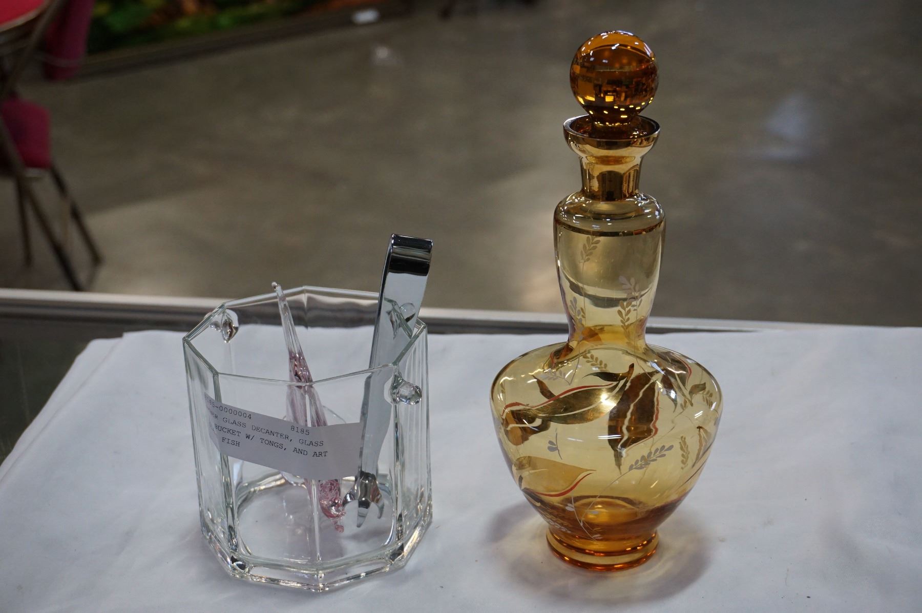 AMBER GLASS DECANTER, GLASS ICE BUCKET W/ TONGS, AND ART GLASS FISH
