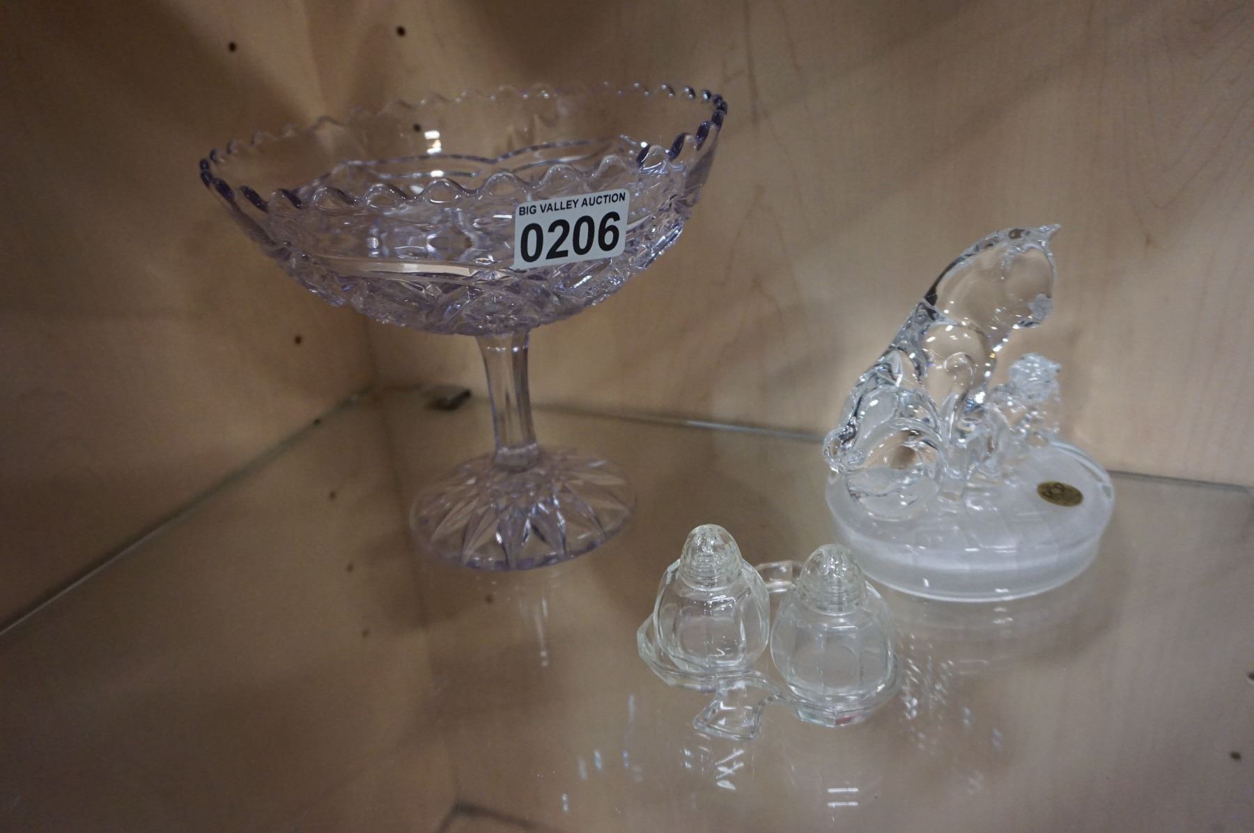 AMYTHYST GLASS PEDESTAL BOWL AND GLASS SALT AND PEPPER AND CAT FIGURE