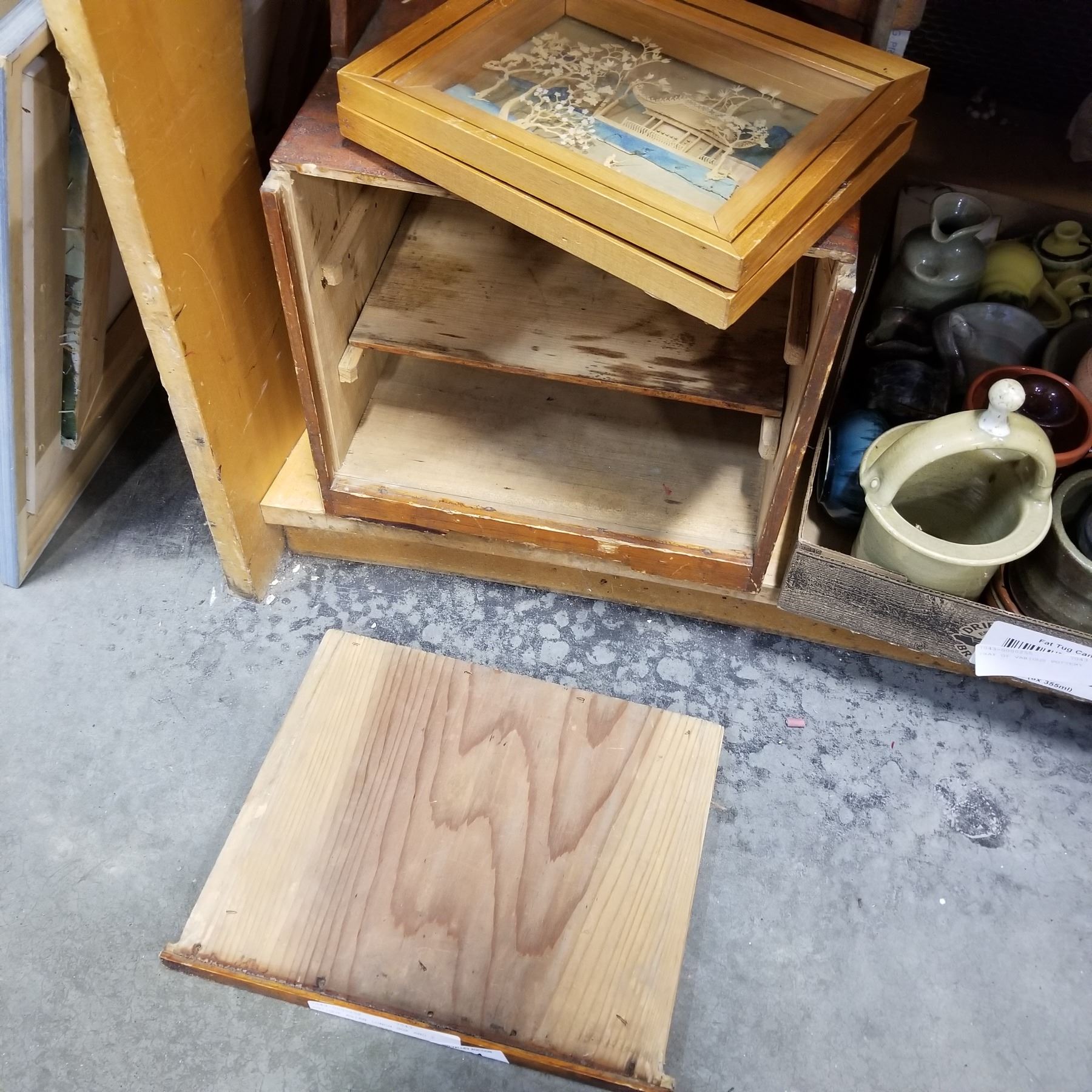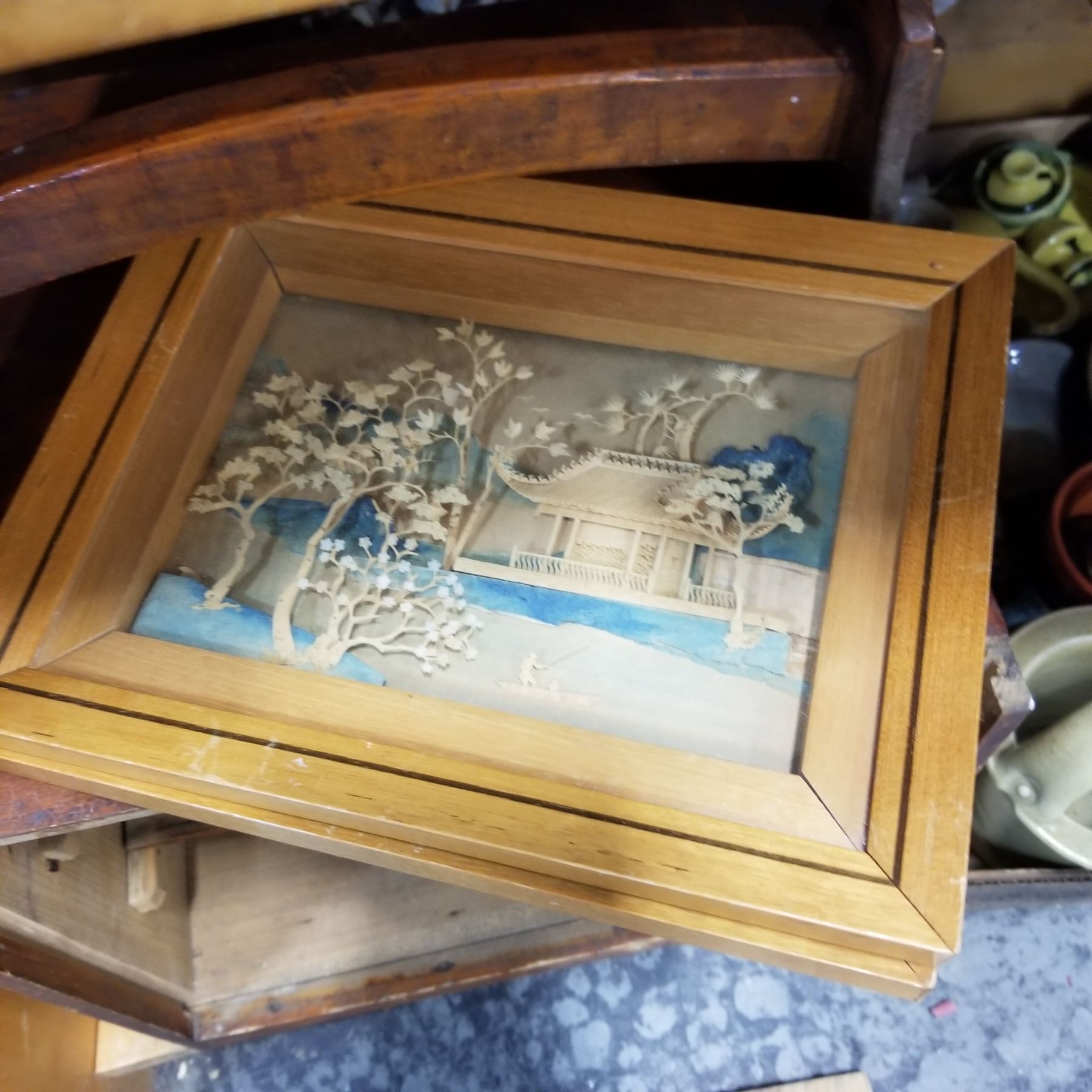 ANTIQUE ASIAN LUNCH BOX AND 2 SHADOW BOX PICTURES