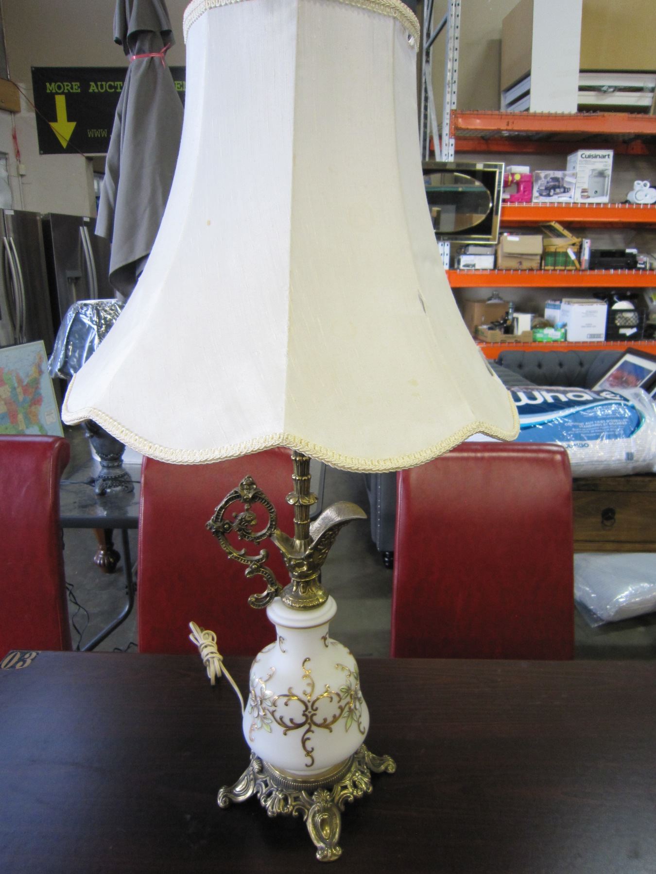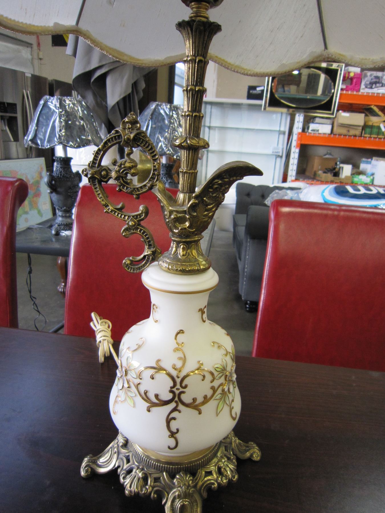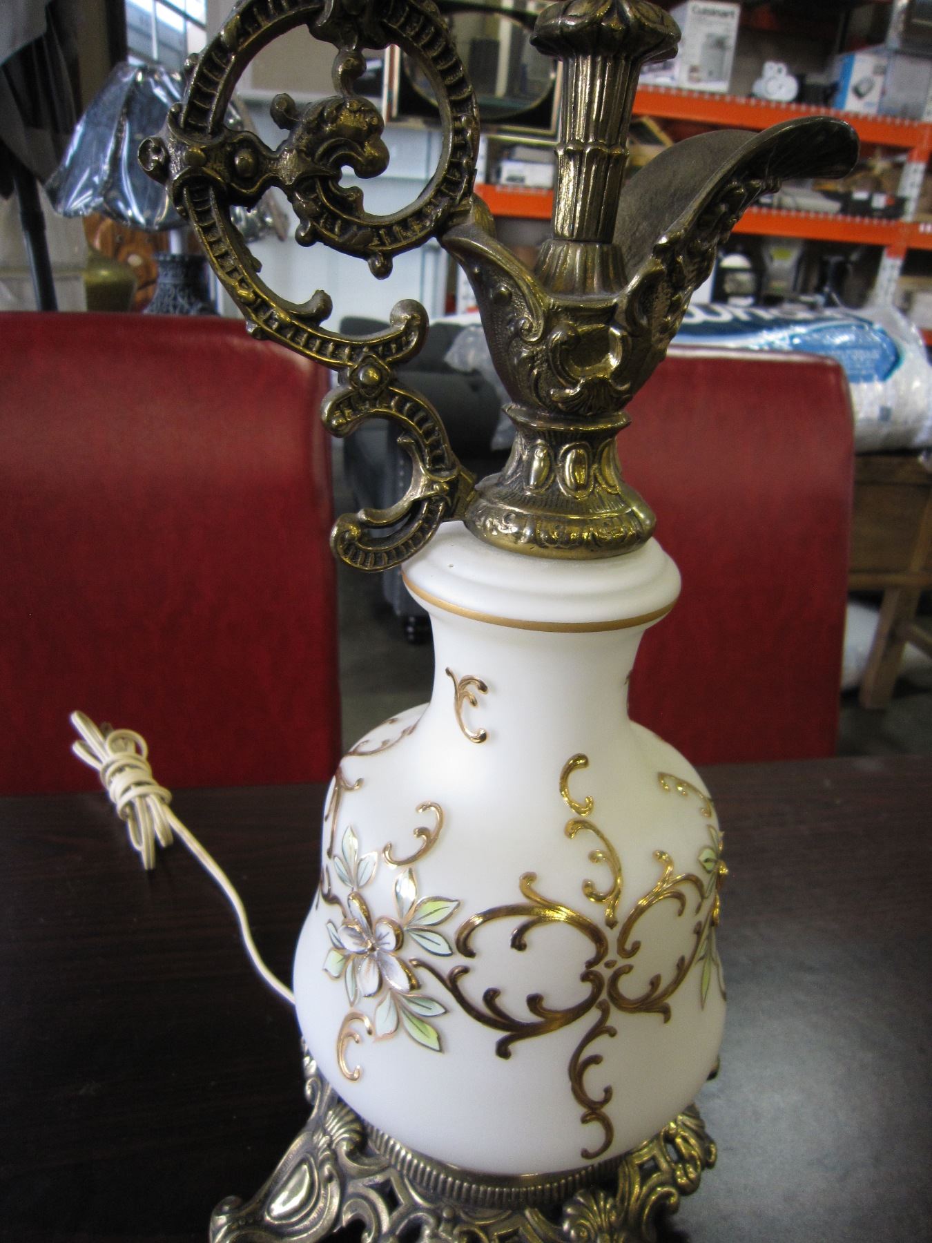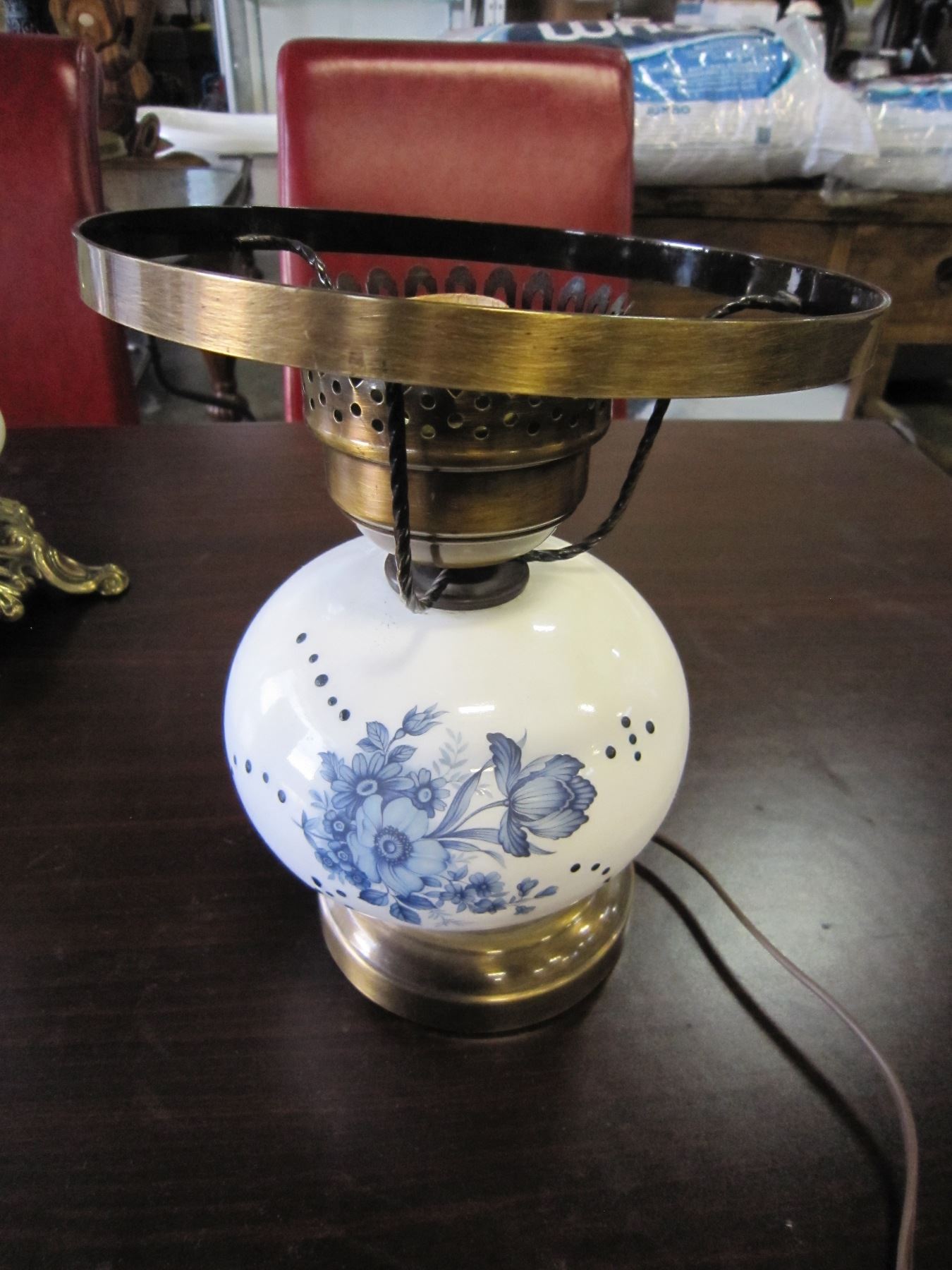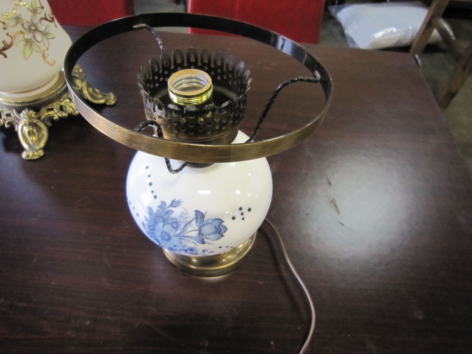ANTIQUE BRASS AND GLASS LAMP AND WHITE AND BLUE FLOWERS LAMP VINTAGE