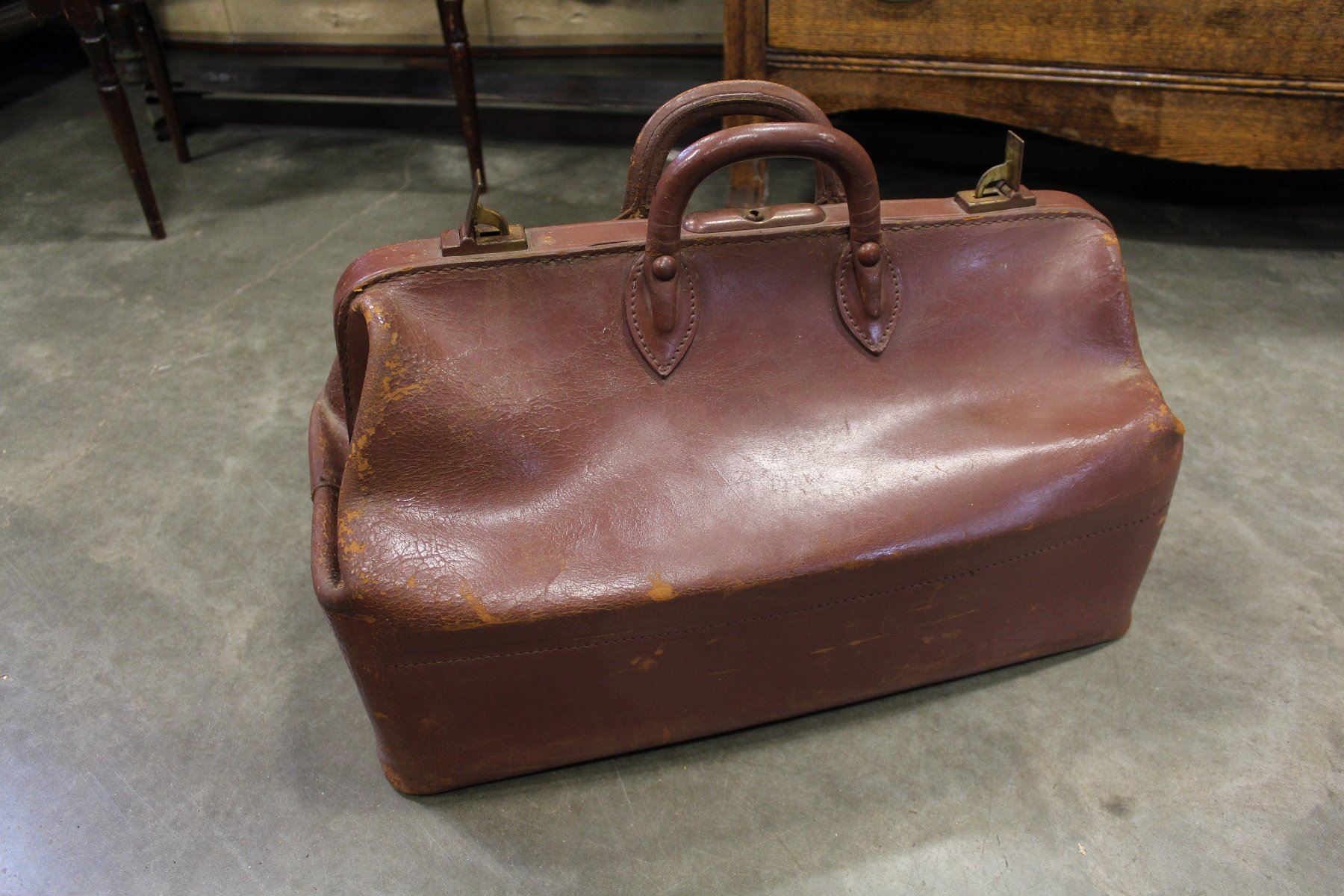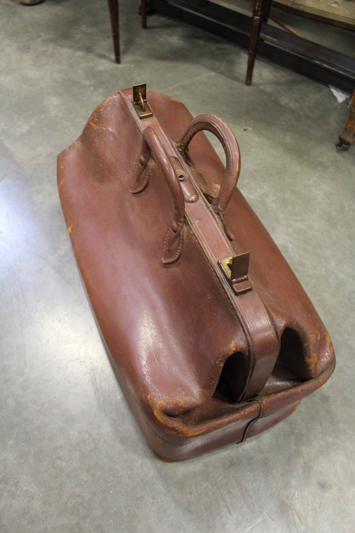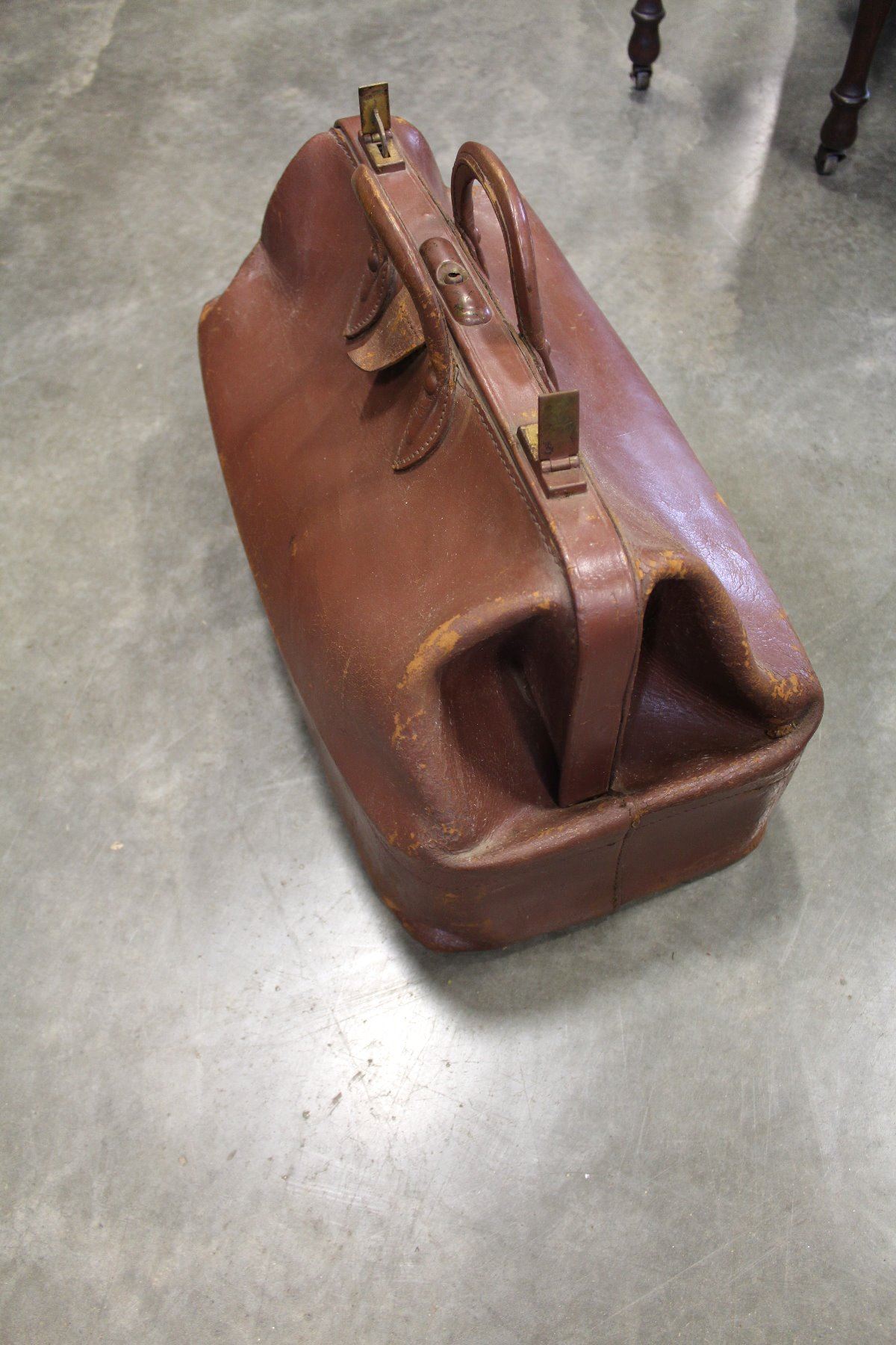 ANTIQUE BROWN LEATHER DOCTORS BAG WITH BRASS LOCKING TABS