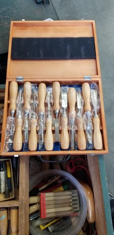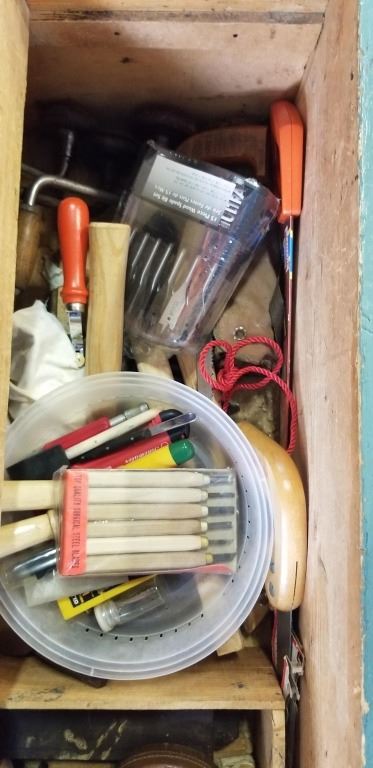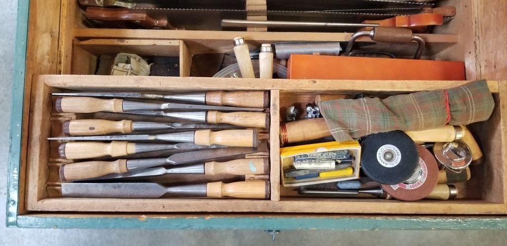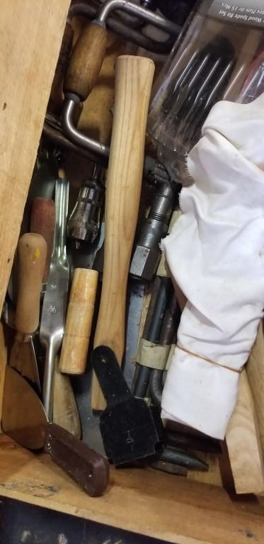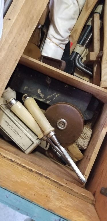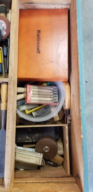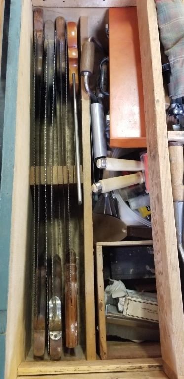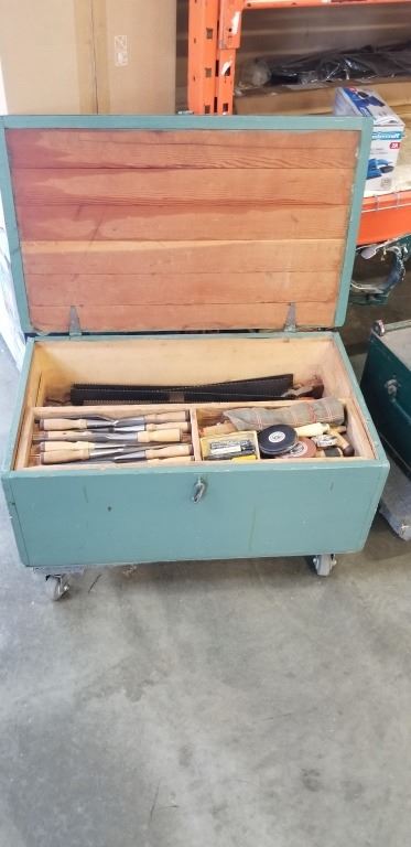 ANTIQUE CARPENTERS TOOL BOX WITH SAWS, CHISELS, ETC